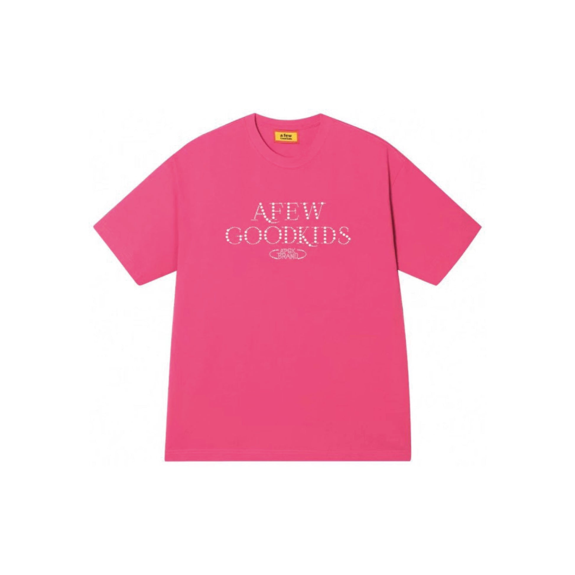 The A Few Good Kids Pearl & Rhinestone SS T-Shirt in 'Pink' merges minimal design with bold embellishment, featuring the brand’s name and “AFGK in Paris” slogan across the chest in shimmering pearl and rhinestone accents. Crafted from premium cotton, this tee offers a soft, comfortable fit with a luxurious edge. The black backdrop enhances the sparkle of the embellishments, making it a standout piece for streetwear lovers who appreciate statement detailing.