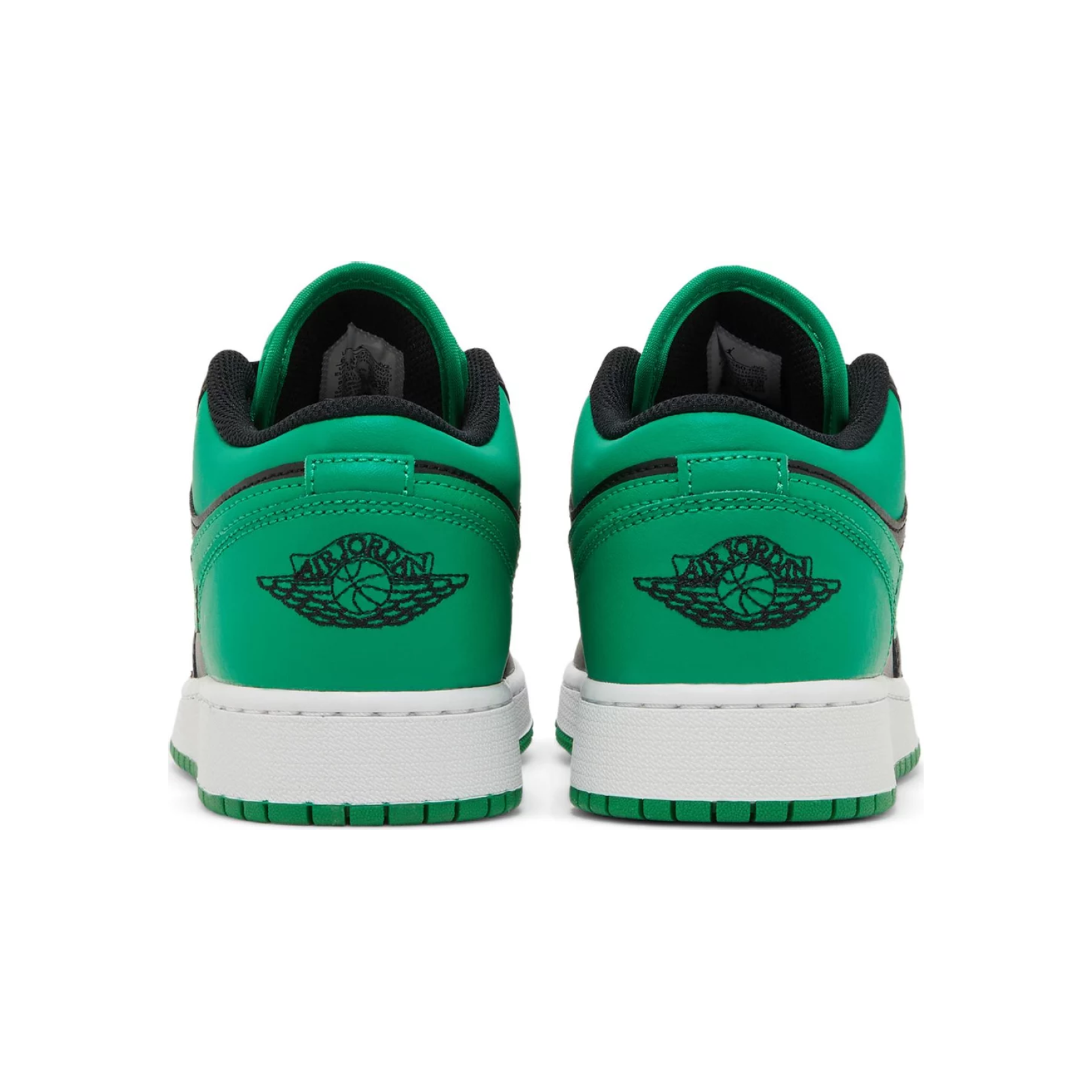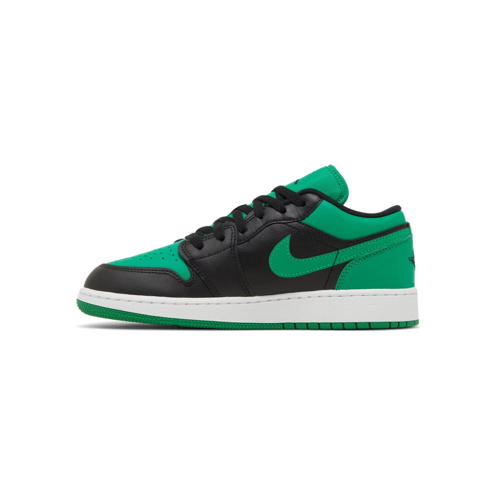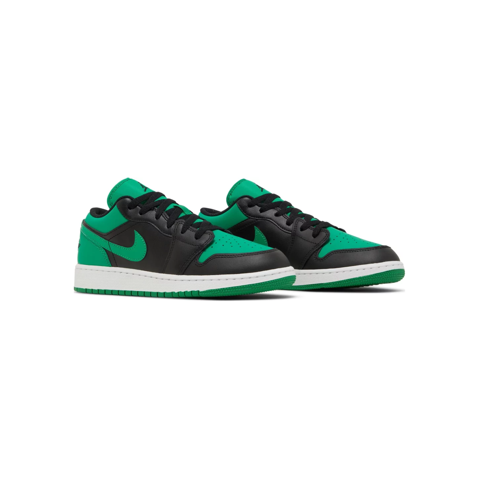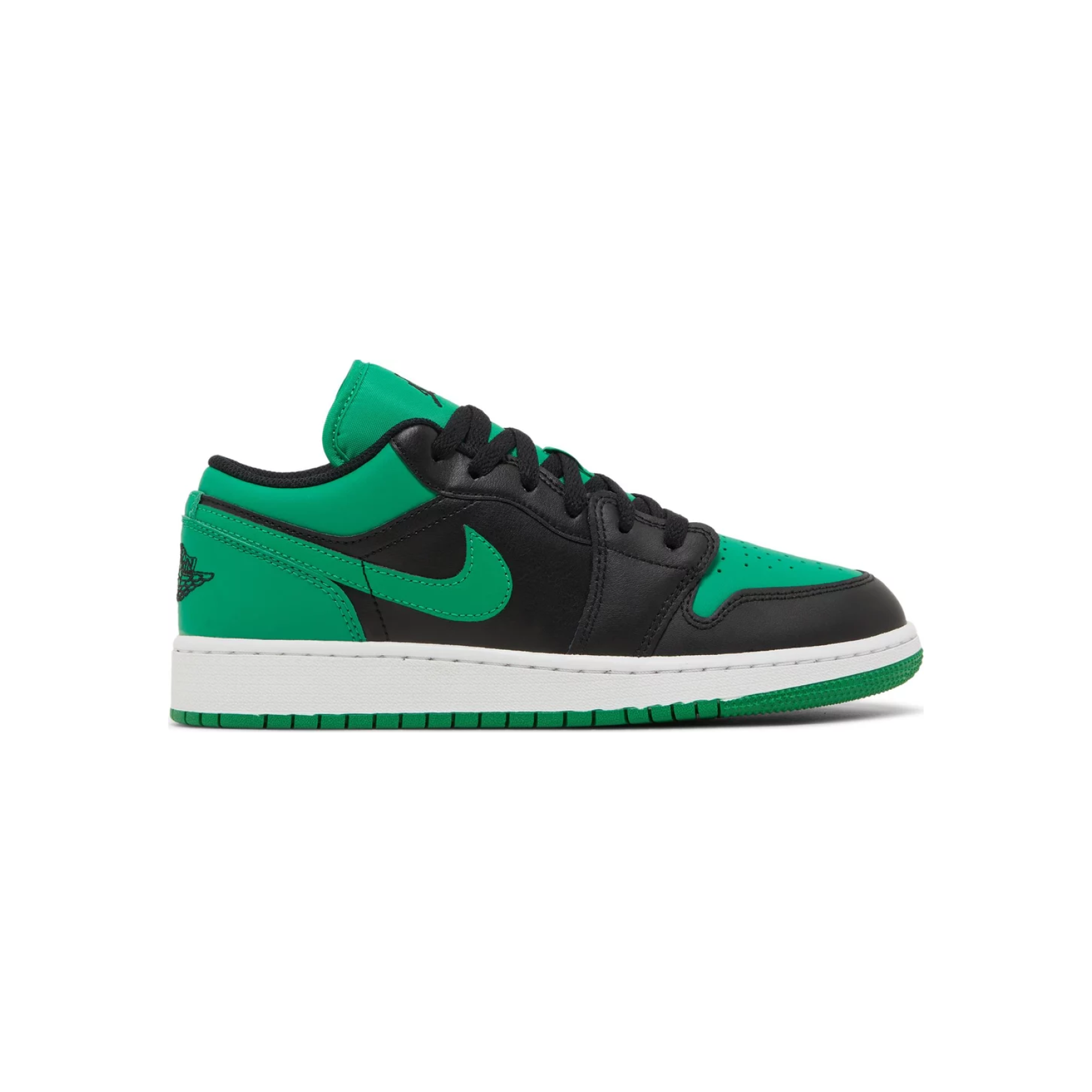 The Air Jordan 1 Low (GS) 'Black Lucky Green' brings bold energy to a classic silhouette, perfect for young sneakerheads looking to make a statement. Featuring a sharp combo of black leather overlays and vibrant Lucky Green accents on the Swoosh, toe box, and heel, this grade school edition is both playful and powerful.