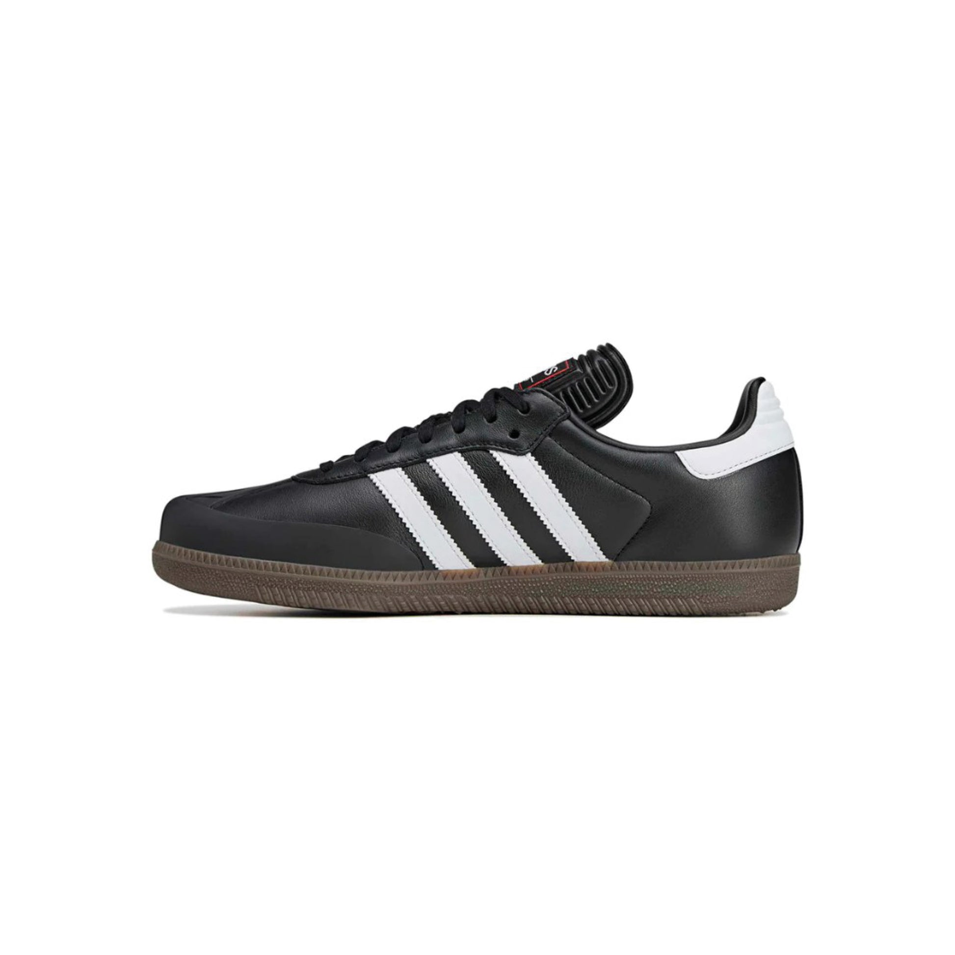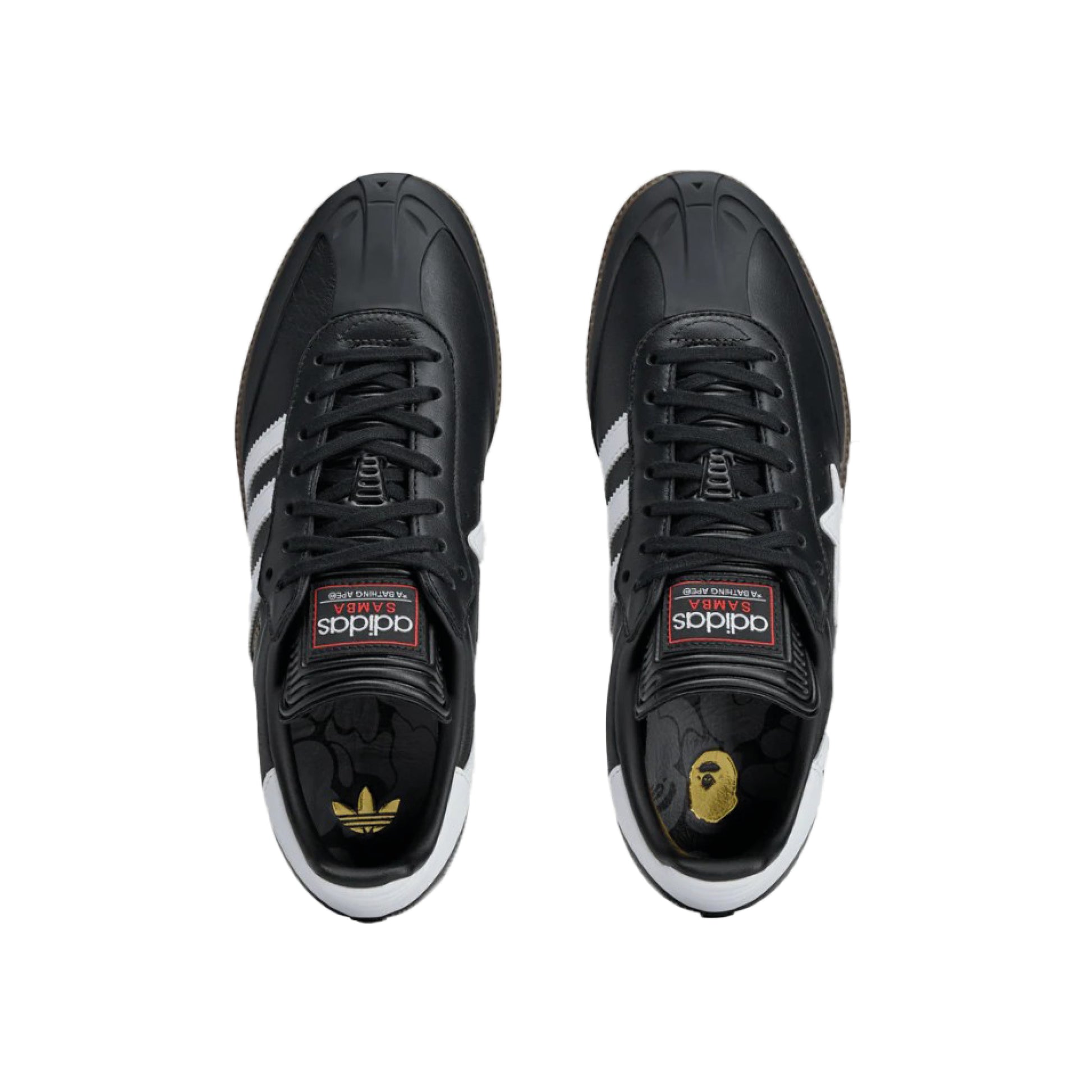 The BAPE x adidas Samba 'Black White Gum' blends classic football-inspired heritage with streetwear prestige. adidas’ legendary Samba silhouette is upgraded with BAPE’s bold design language, featuring a smooth black leather upper, contrasting white BAPE STA logo, and a gum rubber sole for timeless style. Gold foil co-branding and unique tongue detailing underline its limited-edition status. Perfectly versatile, this collaboration pairs retro sports culture with BAPE’s iconic street aesthetic, making it an essential for sneakerheads and collectors alike.