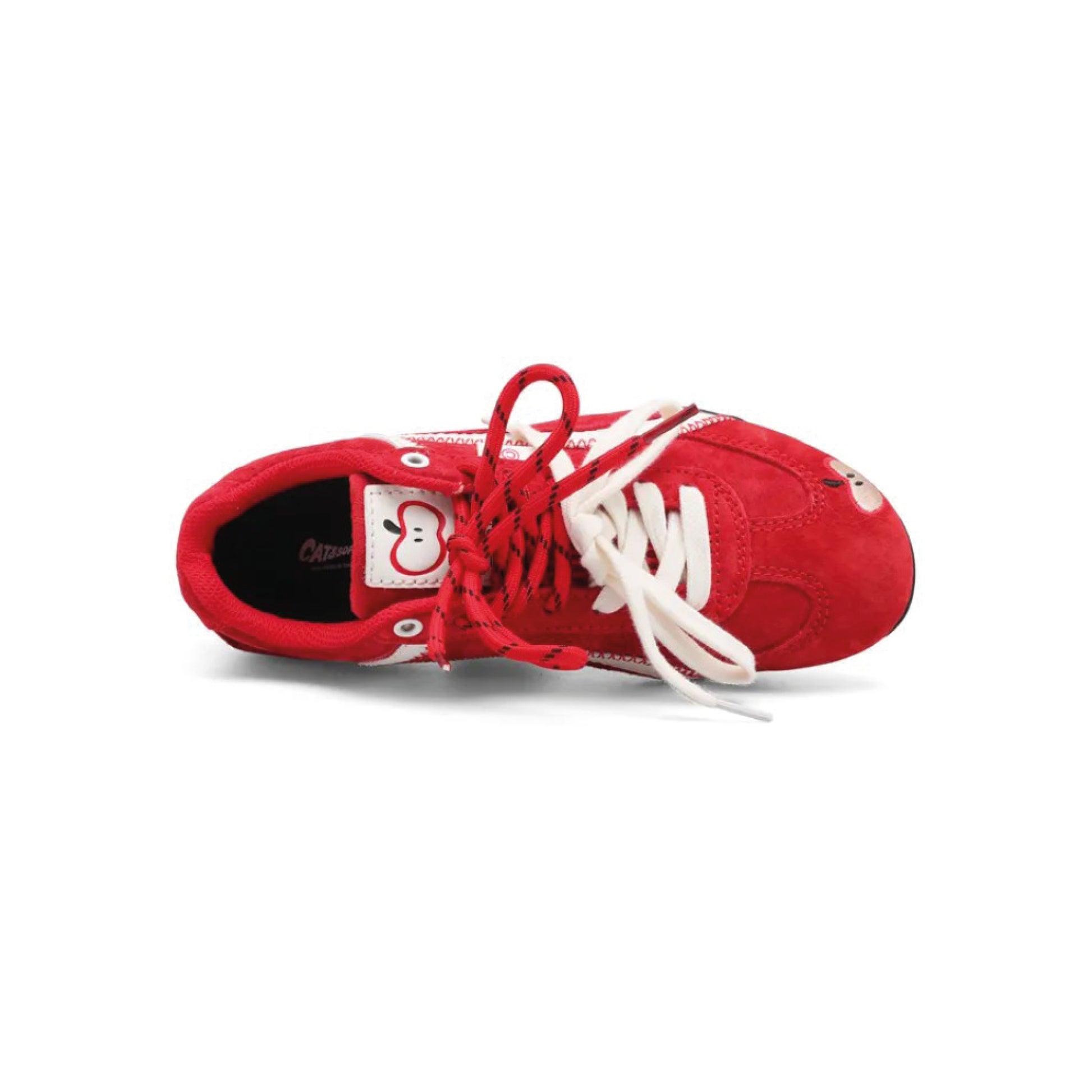 The Cat & Sofa Racer "Red" is a bold lifestyle sneaker that fuses playful design with street-ready function. Crafted with premium red suede, the shoe features a whimsical embroidered apple motif at the toe, contrasting white overlays with visible stitching, and dual-color laces for added character. The chunky black outsole provides durability and grip, while the low-cut silhouette makes it easy to style for both casual and standout looks. Known for its unique aesthetic, Cat & Sofa continues to push boundaries in sneaker culture with this vibrant design.
