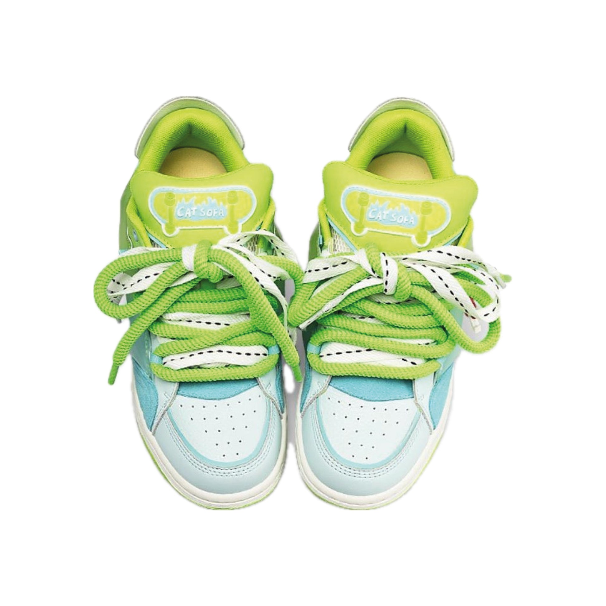 Introducing the Cat and Sofa x EASC ‘MintJelly’, a futuristic low-top sneaker that blends streetwear attitude with playful energy. Drenched in an eye-popping mint green and ice blue palette, this pair features a mix of glossy TPU and textured leather for maximum visual impact.