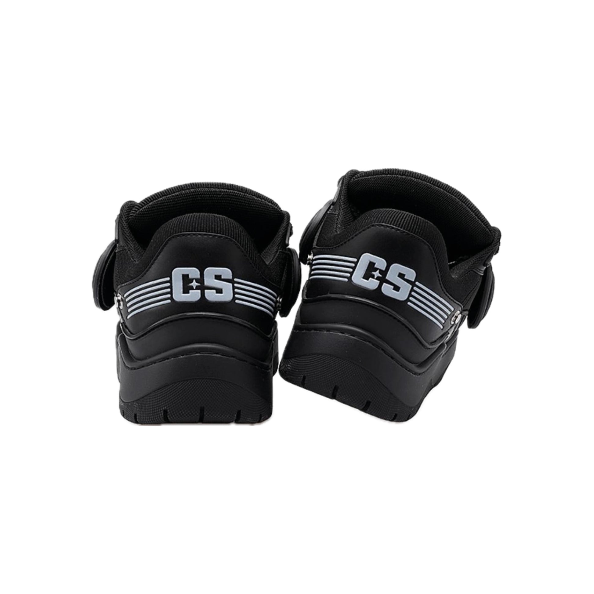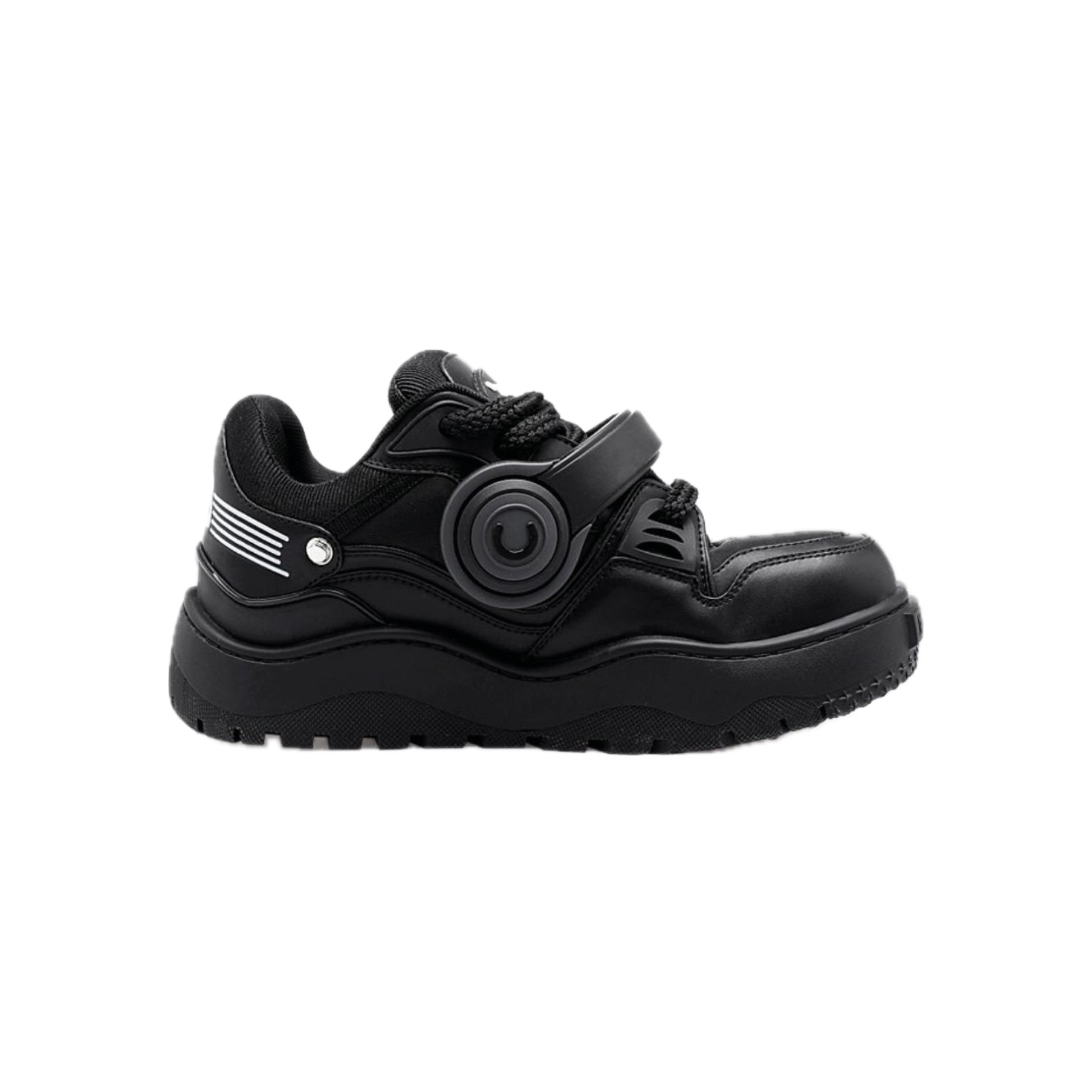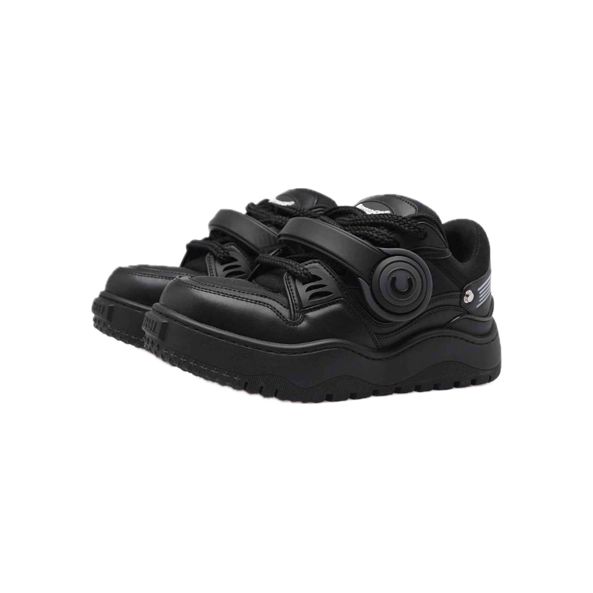 Dressed in an all-black palette from sole to upper, this pair delivers serious attitude with every step. Chunky outsole, mixed-material overlays, and graphic linework around the heel all contribute to the shoe’s distinct visual rhythm. Whether you’re on the streets or styling a statement fit, this silhouette doesn’t whisper — it shouts.