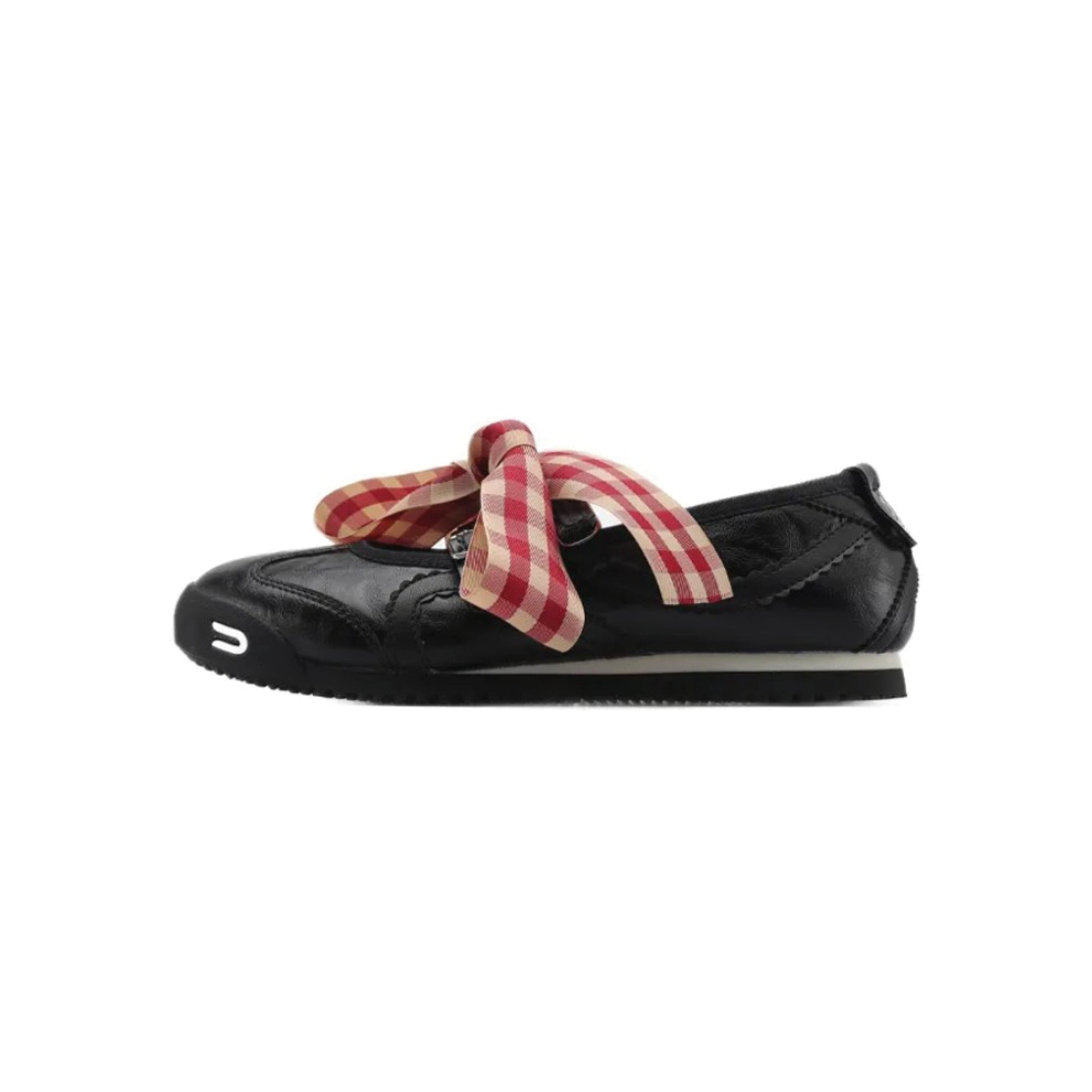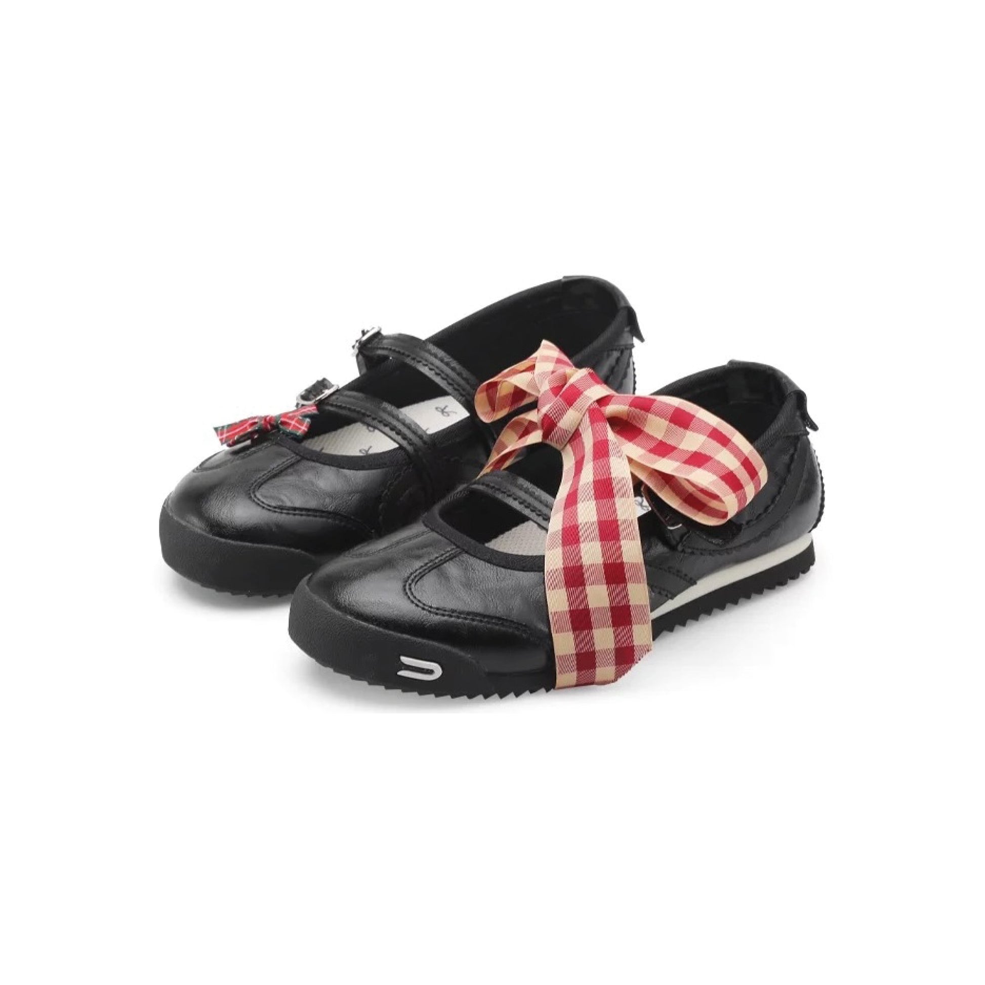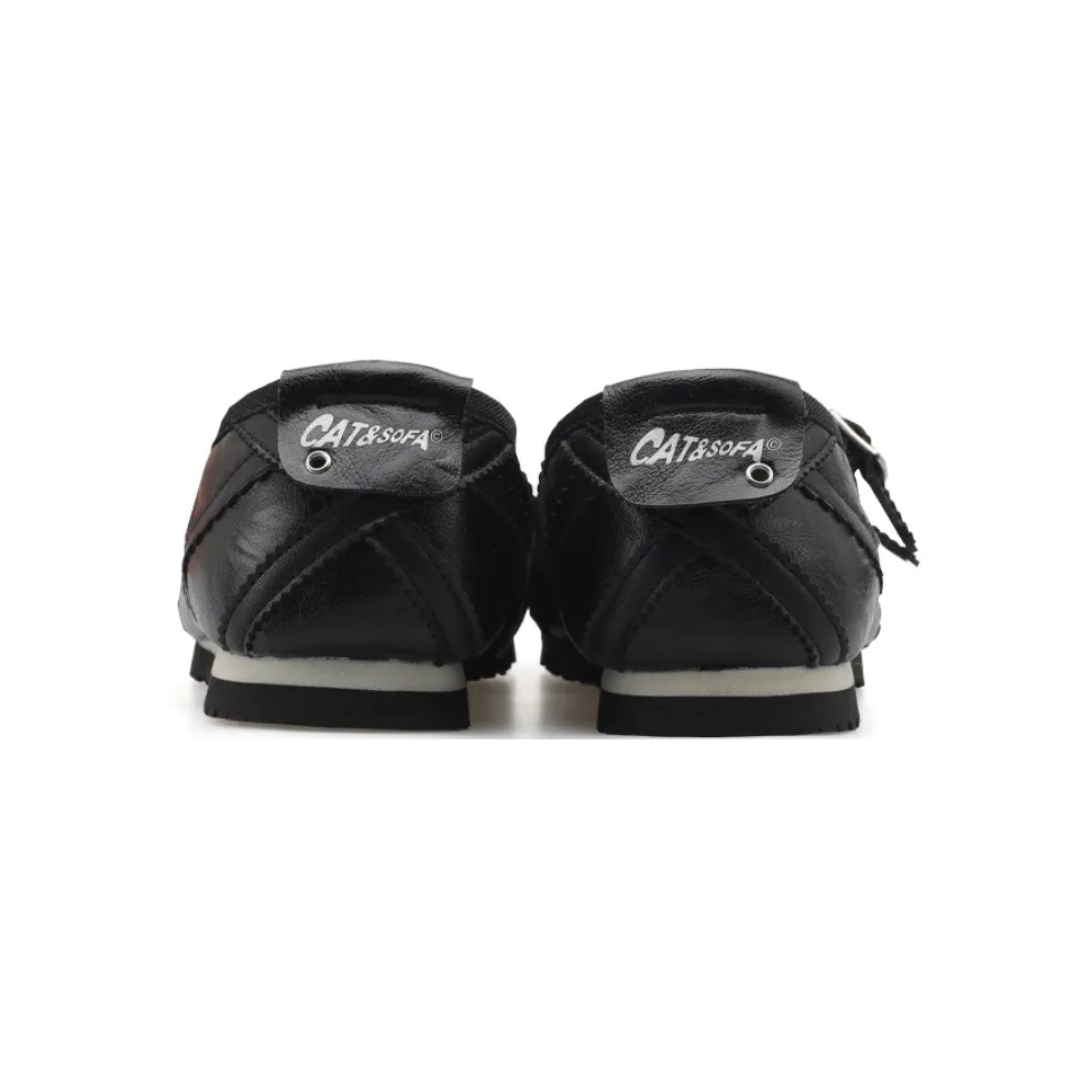 The Cat & Sofa Mary Jane 'Black' blends nostalgic charm with street-ready comfort. This modern reinterpretation of the classic Mary Jane features a glossy black leather upper with curved panel detailing and an exaggerated sneaker sole. The bold red-gingham ribbon adds a playful yet elegant twist — tying the look between dainty femininity and modern urban flair.