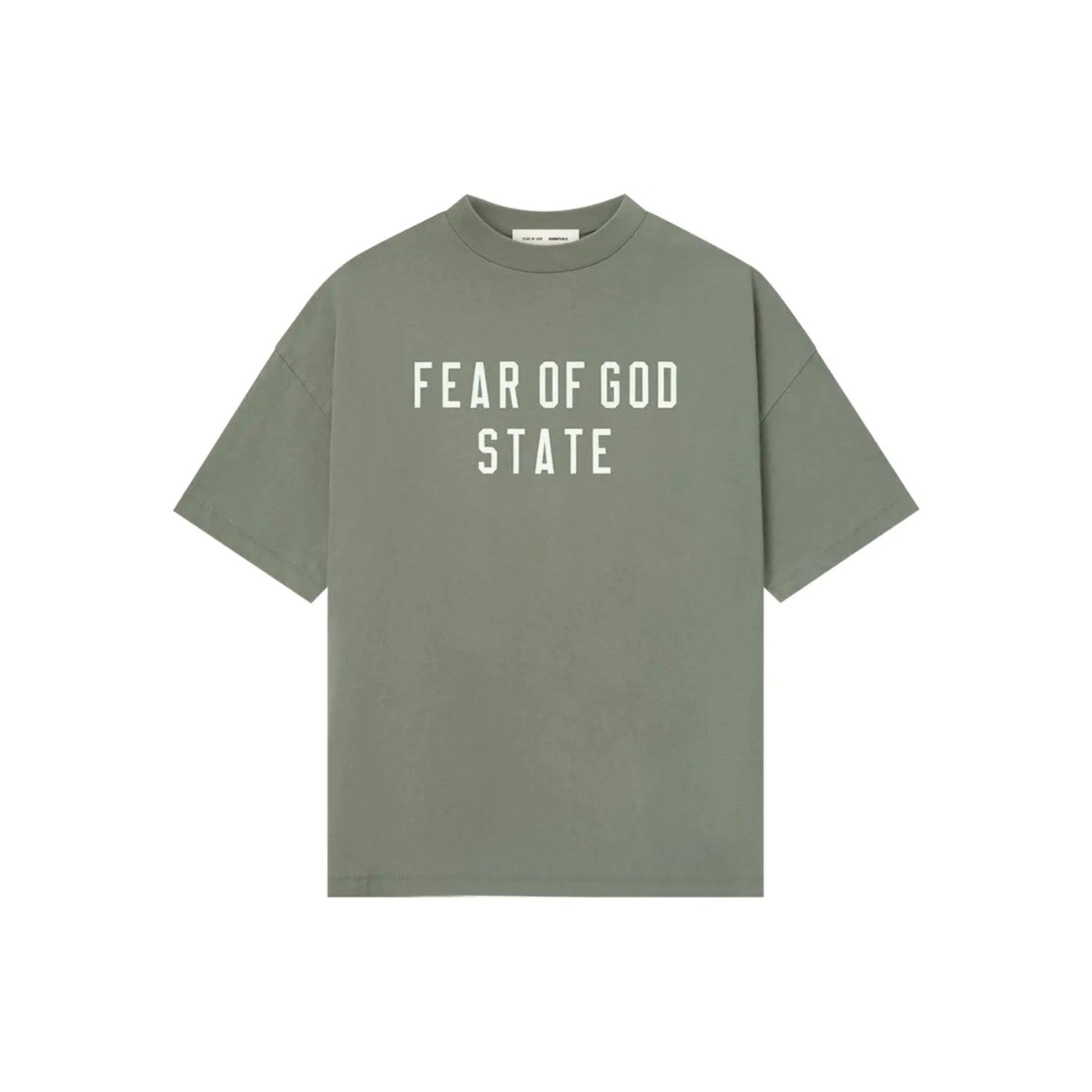 The Fear of God Essentials 90’s T-Shirt ‘Moss’ reimagines vintage athletic apparel with a modern streetwear twist. Designed in a relaxed oversized fit, the tee features a bold “Fear of God State” varsity-style graphic across the chest, echoing retro collegiate aesthetics.