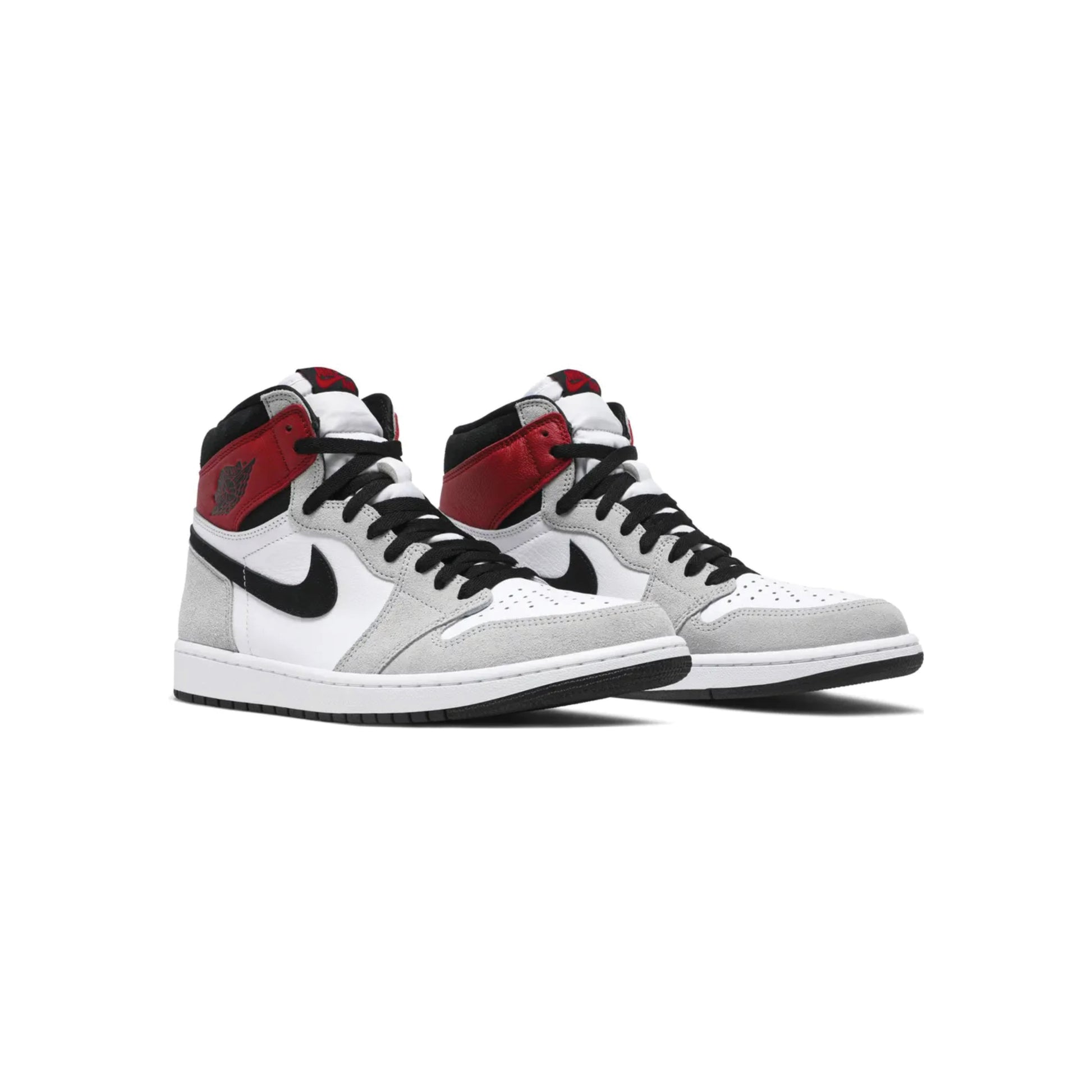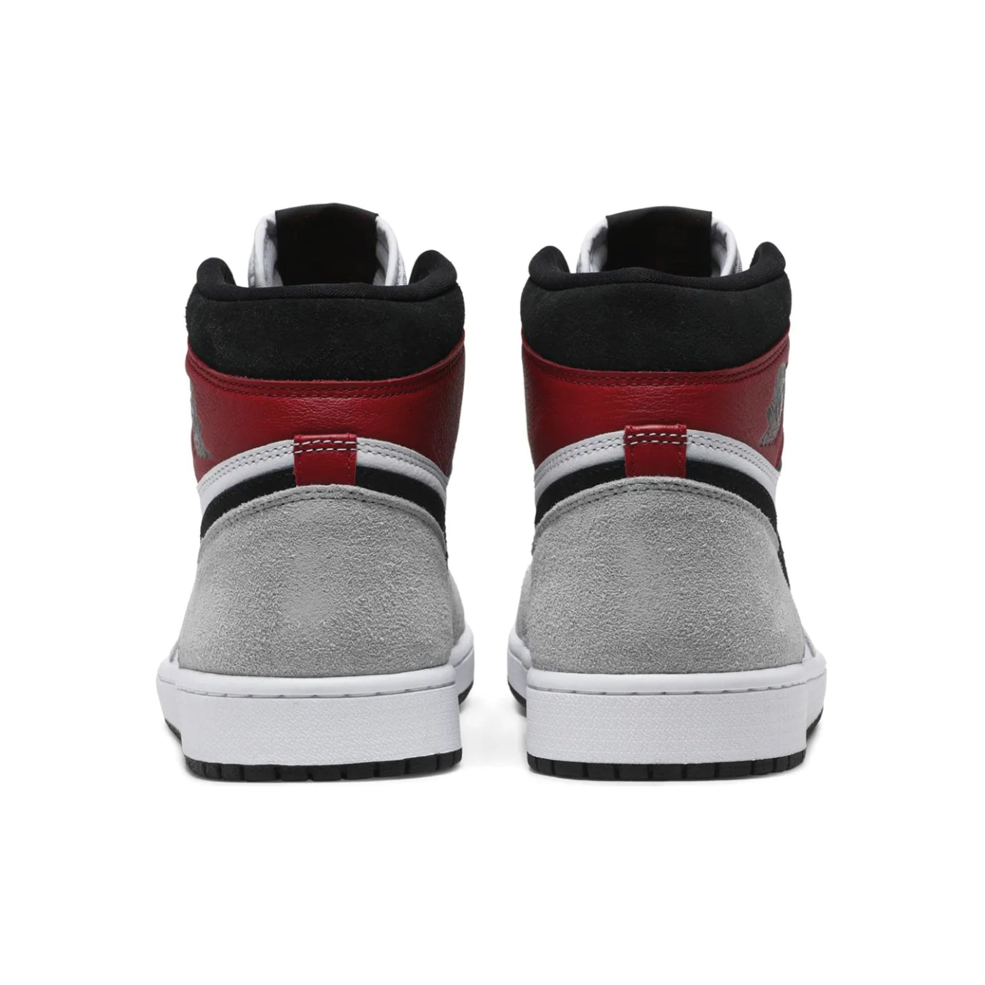 The Air Jordan 1 Retro High OG 'Smoke Grey’ showcases a pop of Varsity Red on the ankle flap, stamped with a classic Jordan Wings logo on the lateral side. The rest of the upper is finished in strictly neutral tones, highlighted by a white leather base with grey suede overlays. A black Nike Swoosh is complemented by matching black hits on the collar and rubber outsole. Nike branding atop the white nylon tongue tag completes the OG aesthetic.