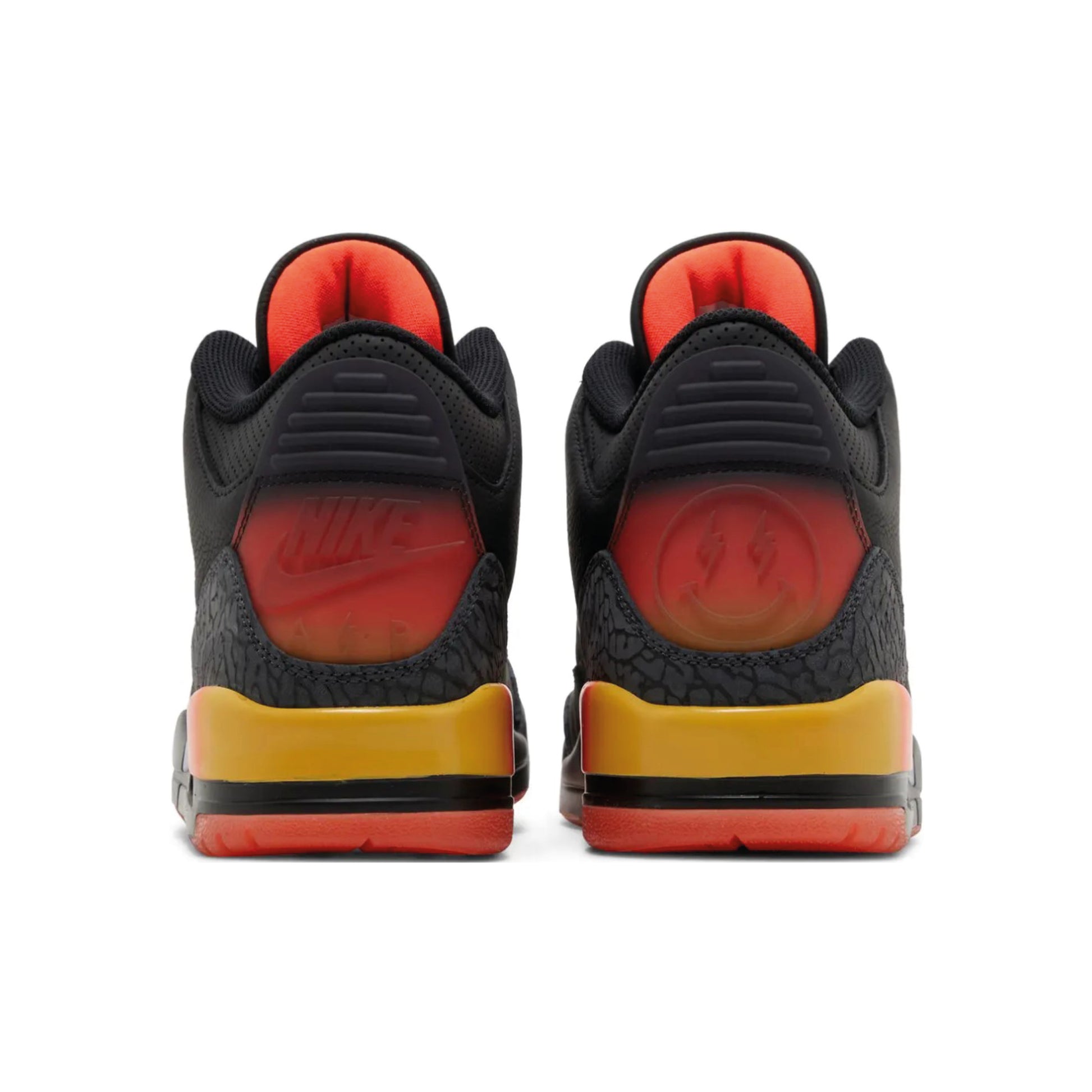 The J Balvin x Air Jordan 3 Retro 'Rio' takes its name from the reggaeton artist's son. The legacy silhouette carries a black leather upper with grey elephant print overlays at the forefoot and heel. Gradient accents in Solar Flare and Total Crimson Abyss coat the back tab, marked with Nike Air branding on the left foot and J Balvin's smiley face logo on the right. The sunset colors are repeated on the rear of the polyurethane midsole, supported by a red-tinged translucent rubber outsole.