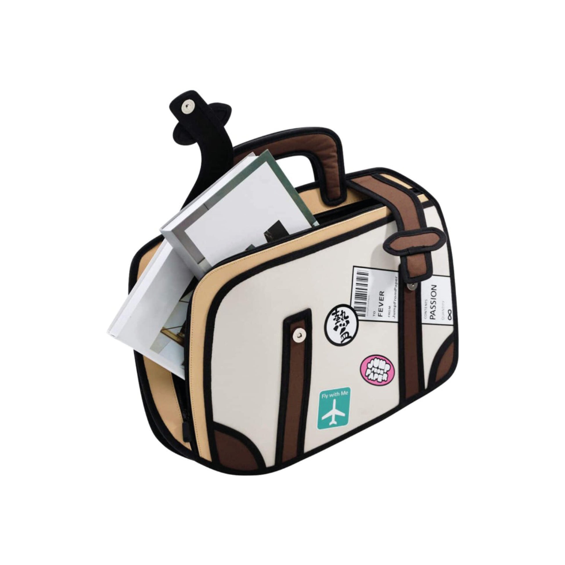 The Jump From Paper Travel Fever Bag in Beige reimagines the art of adventure through playful design. With its signature 2D cartoon aesthetic, this travel-inspired tote captures the excitement of jet-setting in a whimsical, comic-style form. Decorated with printed “travel stickers” like Fly With Me and Passion, it brings imagination to life — blending bold black outlines with creamy beige tones for a retro yet modern flair. Whether for travel, work, or style, this bag turns every outing into a creative escape.
