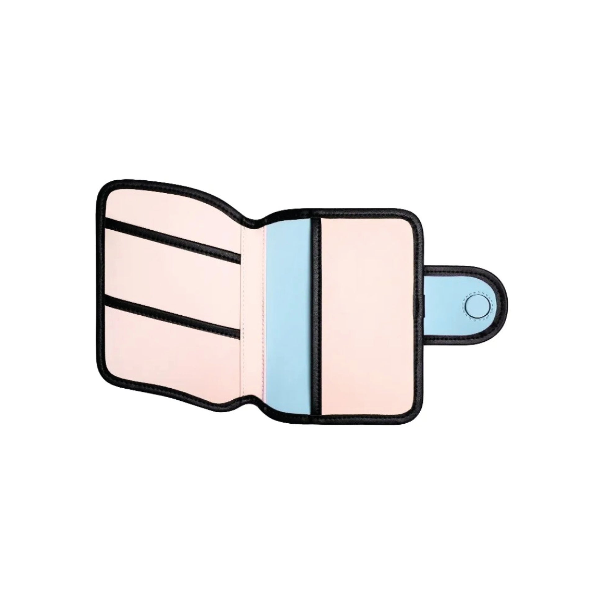 The Jump From Paper Passport Holder in Pink Blue is where travel meets imagination. Featuring the brand’s signature 2D comic-inspired illusion, this compact accessory transforms a simple travel essential into a fun, eye-catching piece of art. With its pastel pink body, baby blue flap, and bold black outlines, it looks like it was drawn straight out of a cartoon — yet it’s perfectly practical for your real-world adventures.