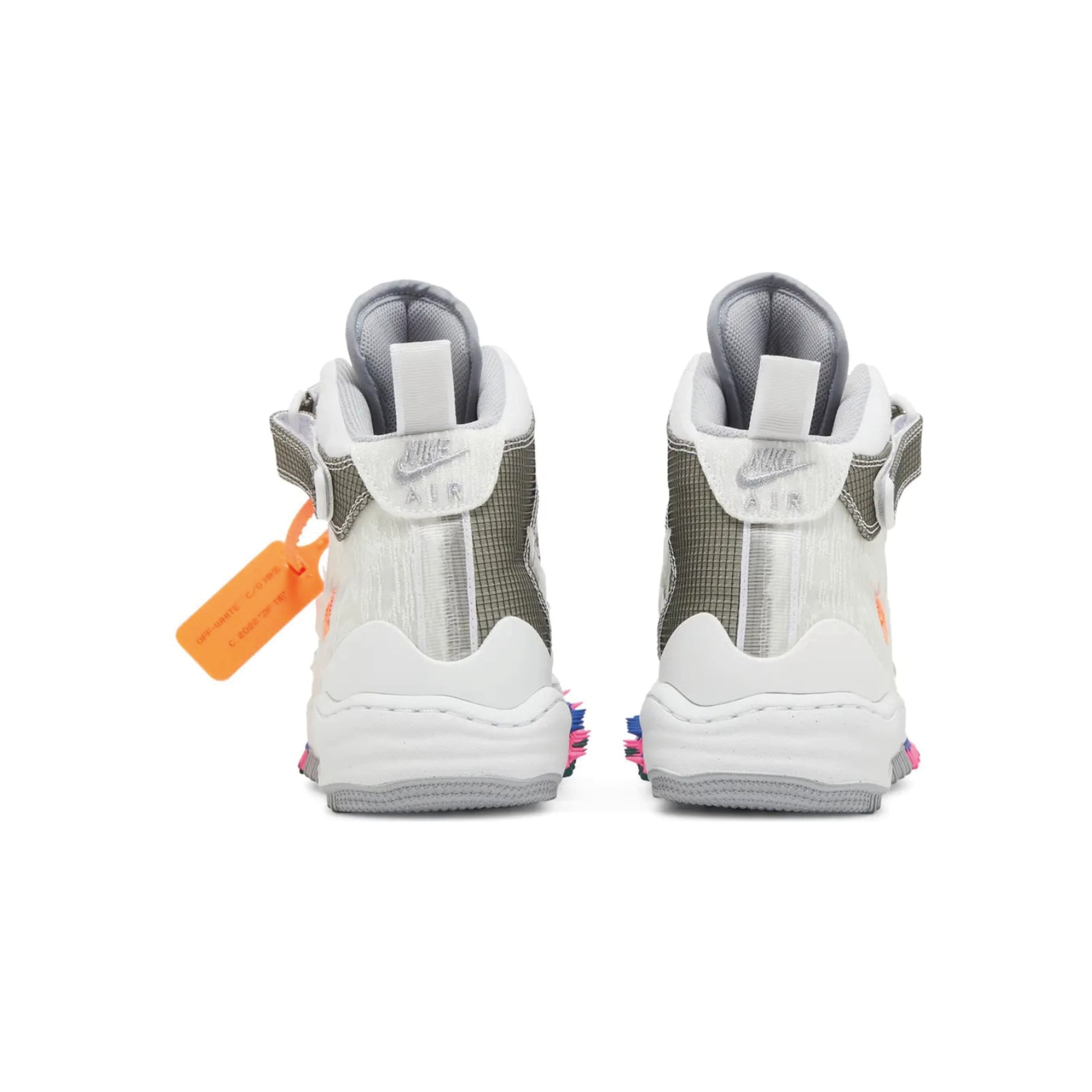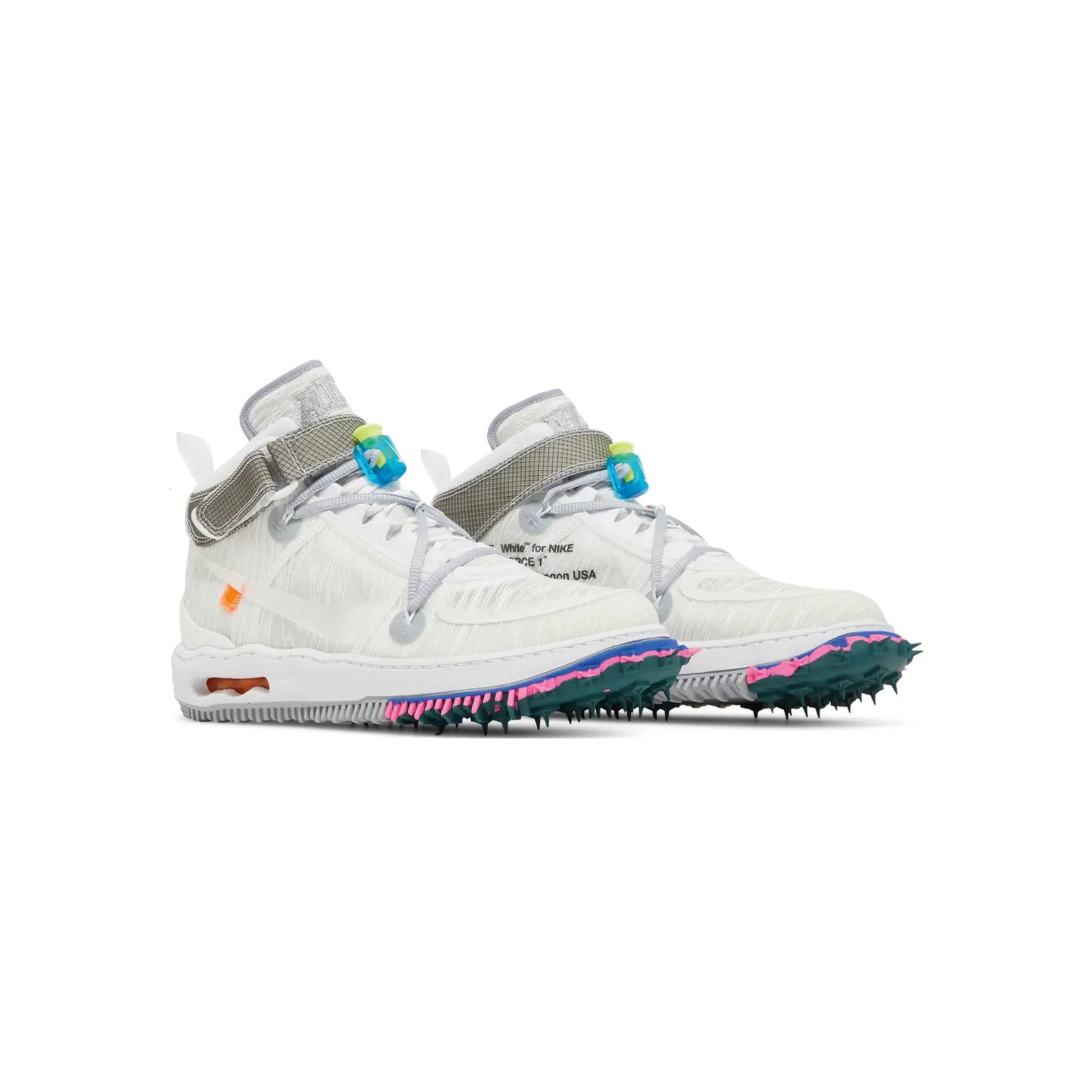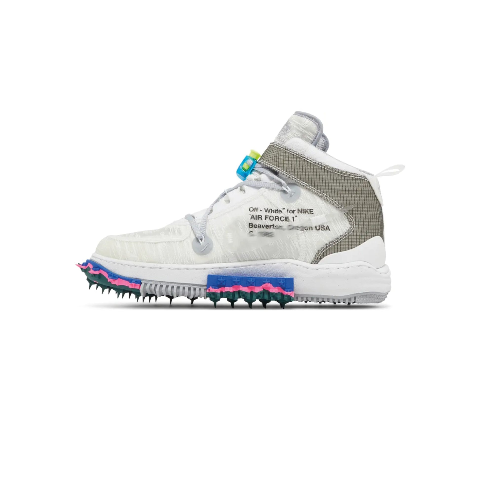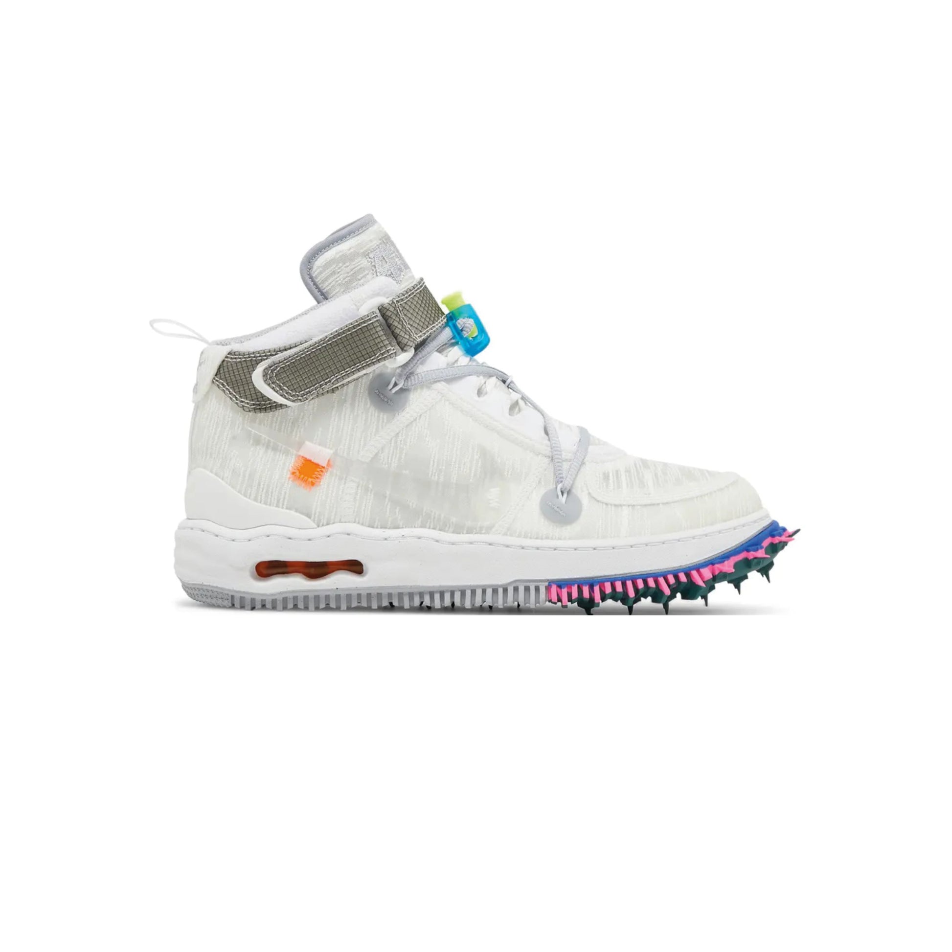 The Off-White x Nike Air Force 1 Mid ‘White’ gives the vintage hoops shoe a fashionable makeover that carries on the visionary legacy of Virgil Abloh. The mid-top carries a white mesh upper, enlivened with a subtle woodgrain print and accented with a translucent Swoosh. In addition to an adjustable ankle strap, the sneaker is secured with traditional laces and a secondary set that feeds through Flywire cables. Signature Off-White flourishes include a coral plastic zip tie and lines of Helvetica text printed on the medial side. The updated midsole features a wavy topline with visible Air-sole cushioning in the heel. Underfoot, the pivot point rubber outsole is studded with track spikes for an edgy aesthetic.