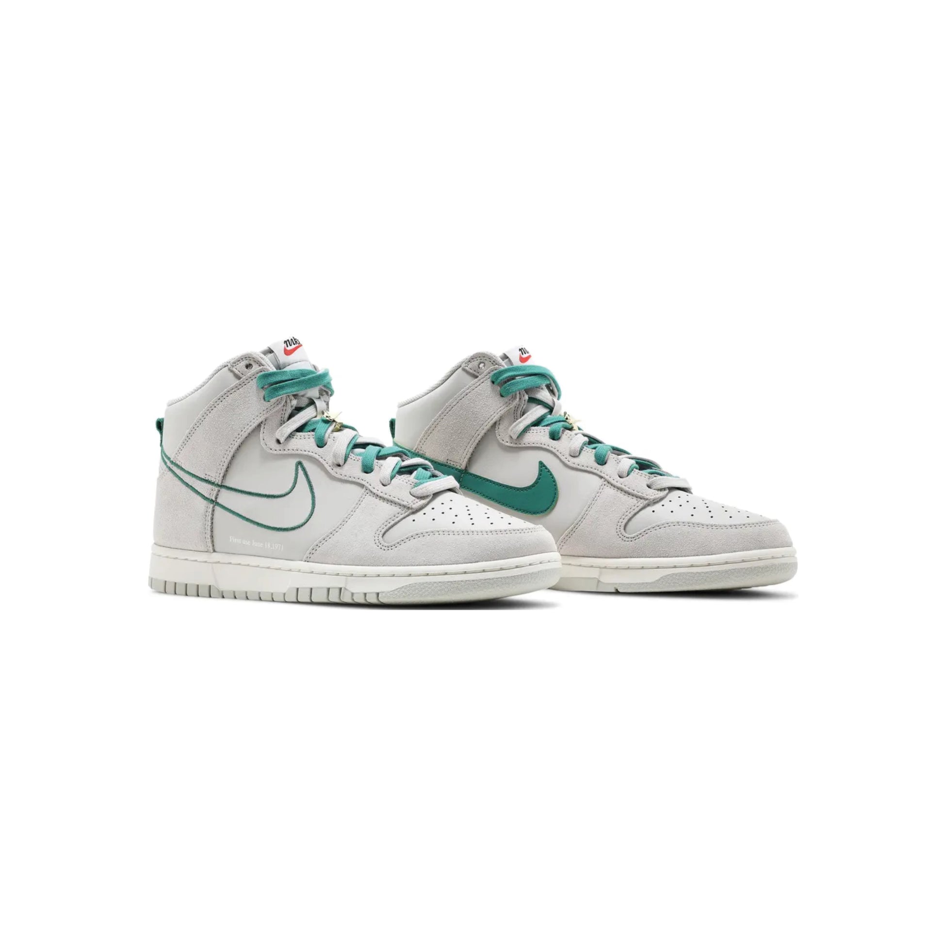 The Nike Dunk High SE ‘Green Noise’ is taken from the ‘First Use Pack,’ celebrating the 50th anniversary of the Swoosh logo. The high-top makes use of an off-white leather upper with tonal suede overlays and a green leather Swoosh on the medial side. A retro Swoosh outlined in green embroidery cuts through the sneaker’s lateral side, accompanied by printed text that reads ‘First use June 18, 1971.’ Double-up laces in white and green are decorated with a Swoosh-shaped lace jewel in a gleaming metallic gold finish.