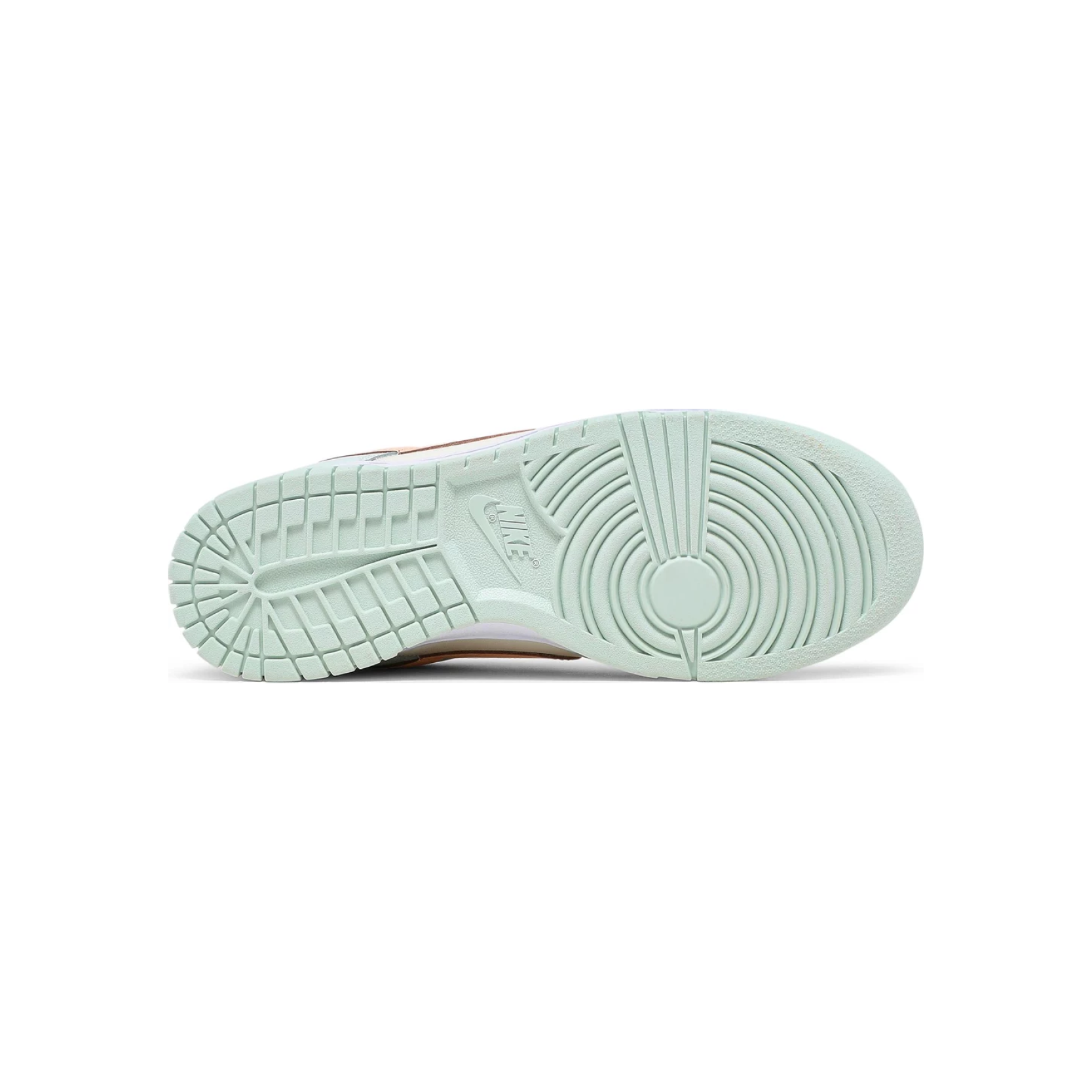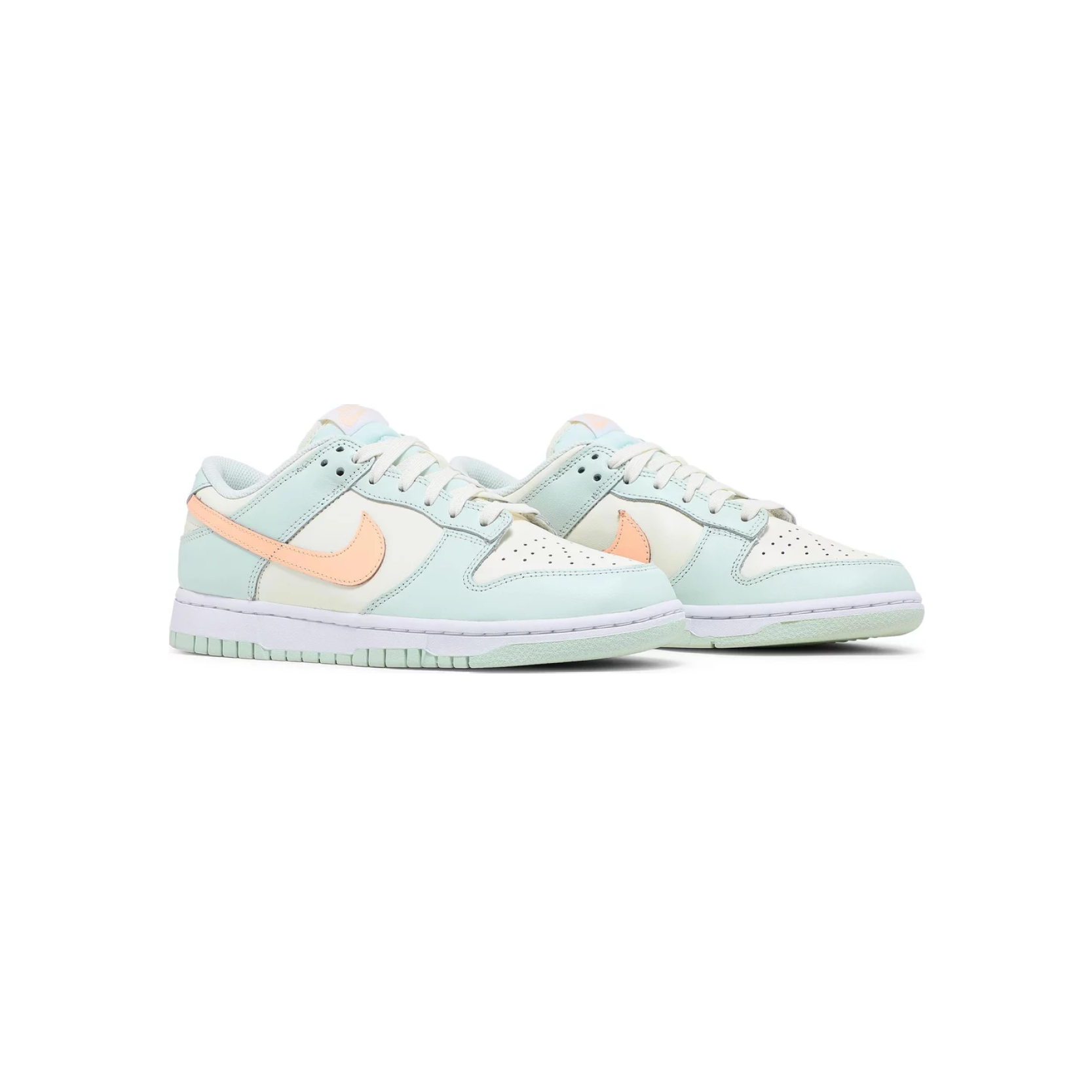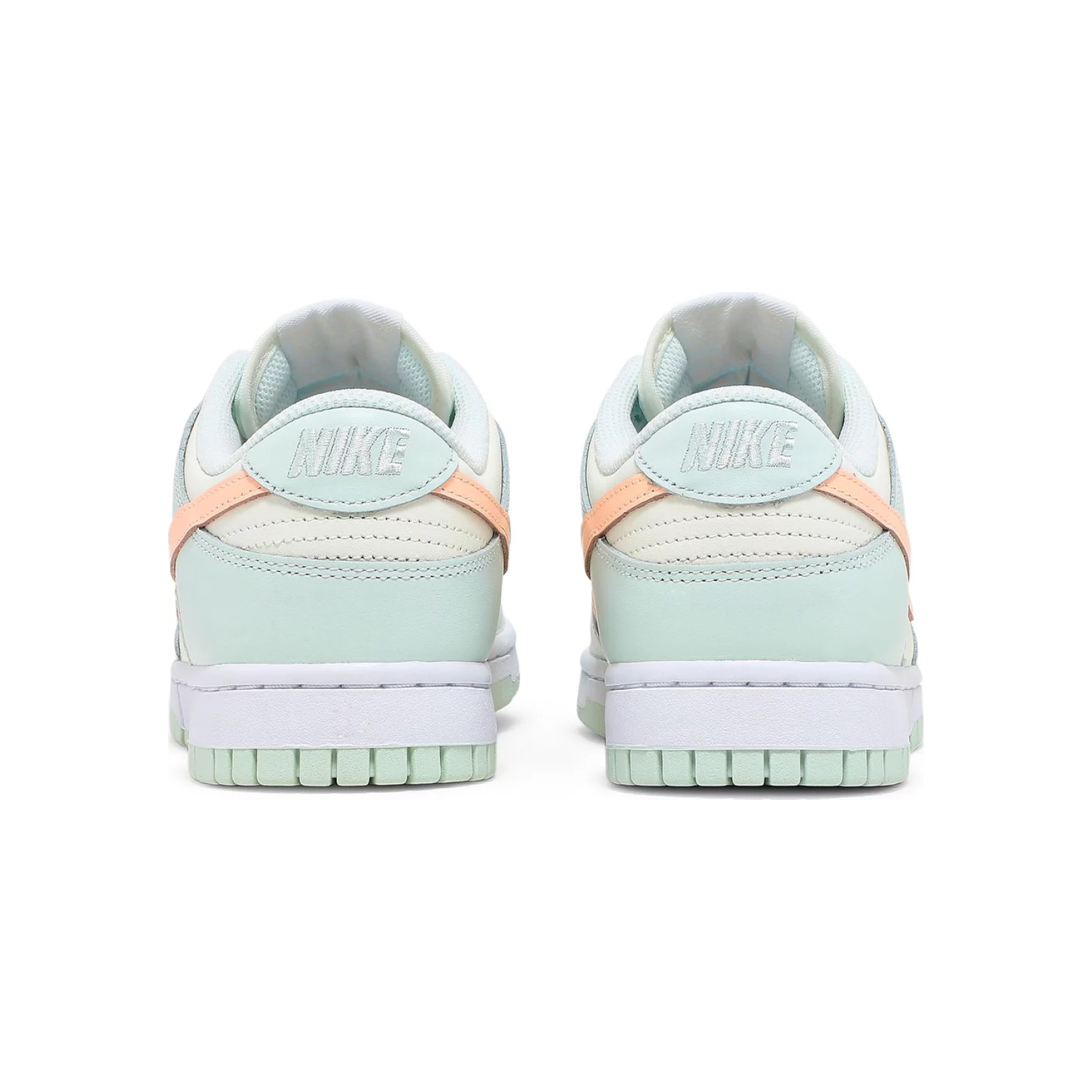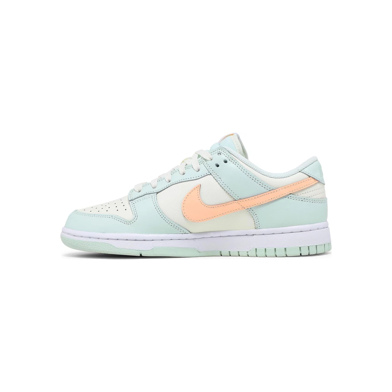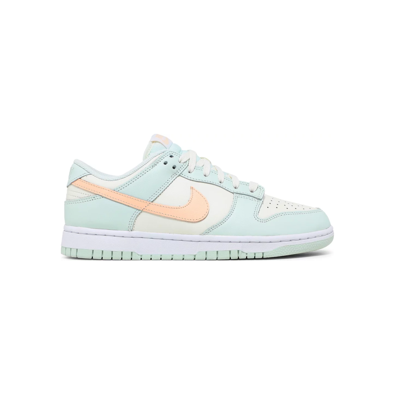 The Nike women’s Dunk Low ‘Barely Green’ showcases a pastel color palette on the vintage hoops shoe originally released in 1985. The leather upper is finished in subtly varying shades of green with a contrasting peach-colored Swoosh. Nike branding hits land on the heel tab and woven tongue tag. The low-top rides on a durable rubber cupsole, featuring a distinctive outsole tread nearly identical to another classic 1985 silhouette, the Air Jordan 1.