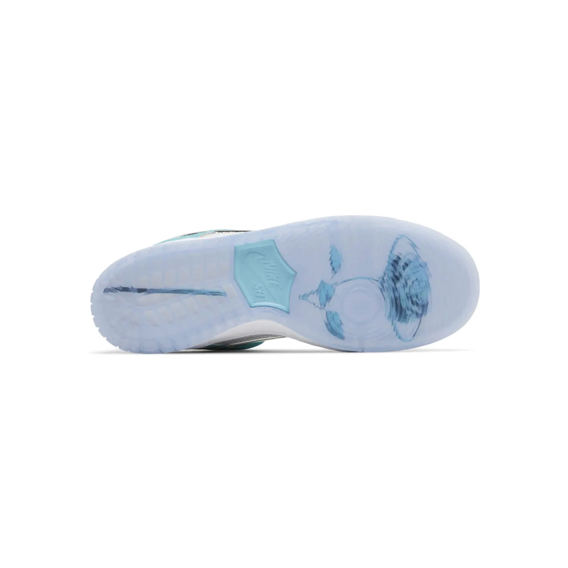 The April Skateboards x Nike Dunk Low SB ‘Turbo Green’ dresses the retro model in an airy white mesh upper, accented with a chrome Swoosh and fortified with suede overlays in a bright teal finish. White leather is utilized on the toe box and back tab, marked with April and Nike SB branding across the left and right shoe. ‘April’ is stamped on the lateral heel, while each tongue tag displays mismatched Nike SB and April logos. Underfoot, a translucent rubber outsole reveals a unique floral graphic.