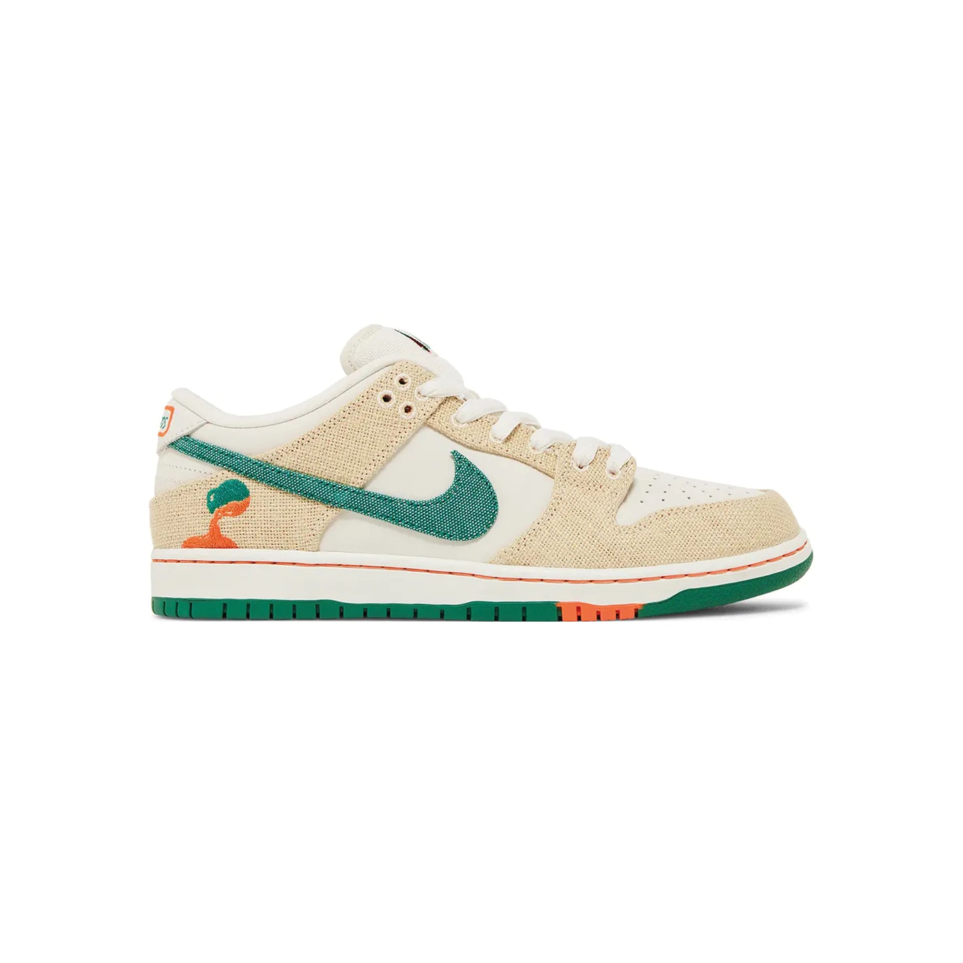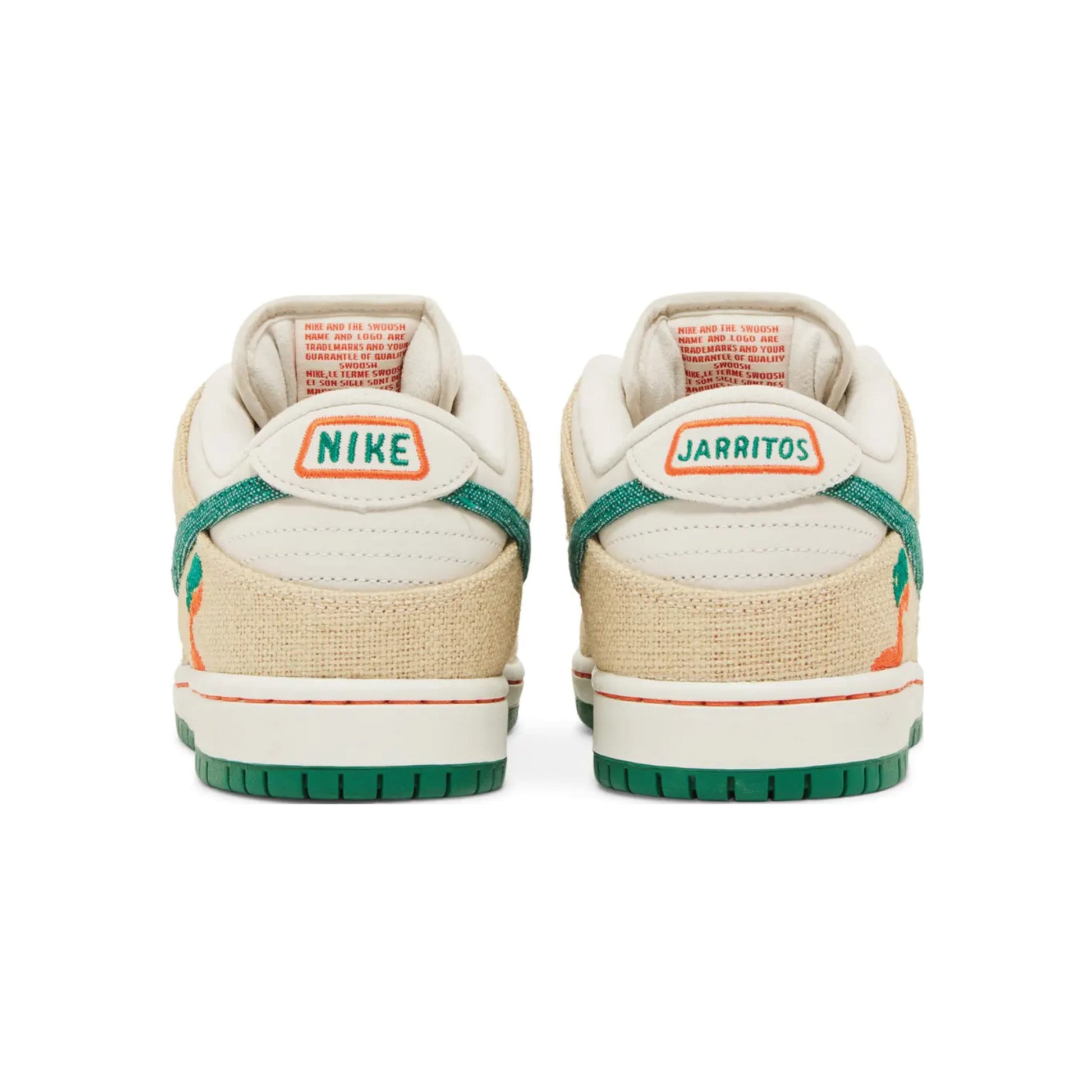 The Jarritos x Nike Dunk Low SB showcases a collaborative design inspired by the popular Mexican soda brand. The upper combines a Phantom white leather base with hemp canvas overlays and a Malachite green textile Swoosh. The Jarritos logo is embroidered in green and orange on the lateral heel, while dual branding embellishes the woven tongue tag. Mismatched heel tabs are emblazoned with 'Nike' and 'Jarritos' across the left and right shoe. Anchoring the sneaker is a durable rubber cupsole that pairs white sidewalls with a two-tone green and orange outsole.