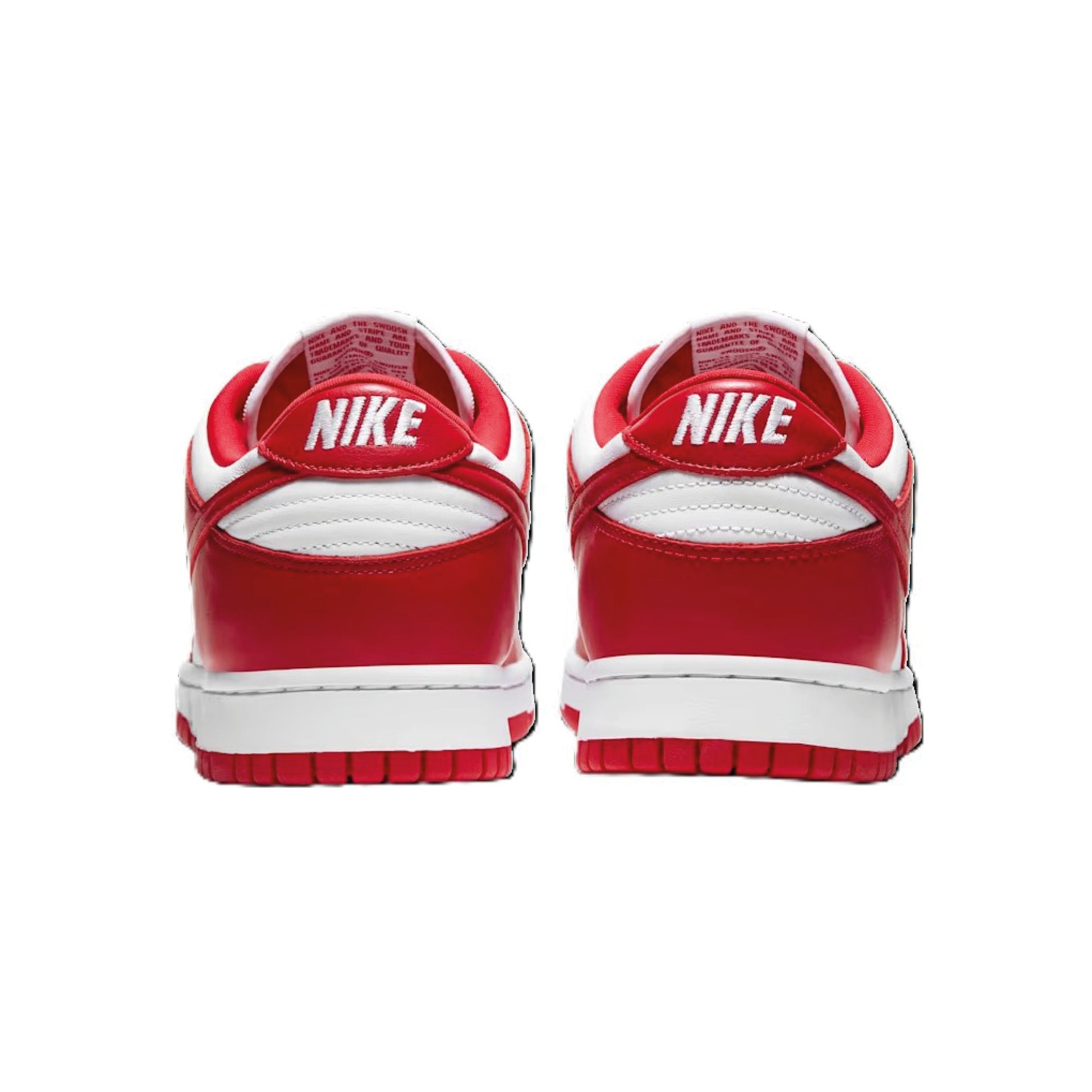 The Nike Dunk Low Retro SP ‘St. John’s’ 2020 celebrates the silhouette’s 35th anniversary with a two-tone color scheme inspired by the original Be True to Your School series from 1985. This pair is essentially a low-top reworking of the Dunk made for the St. John’s University men’s basketball team. The all-leather upper combines a white base with red overlays and a matching red Swoosh. Nike branding hits appear on the woven tongue tag, sockliner and heel tab.