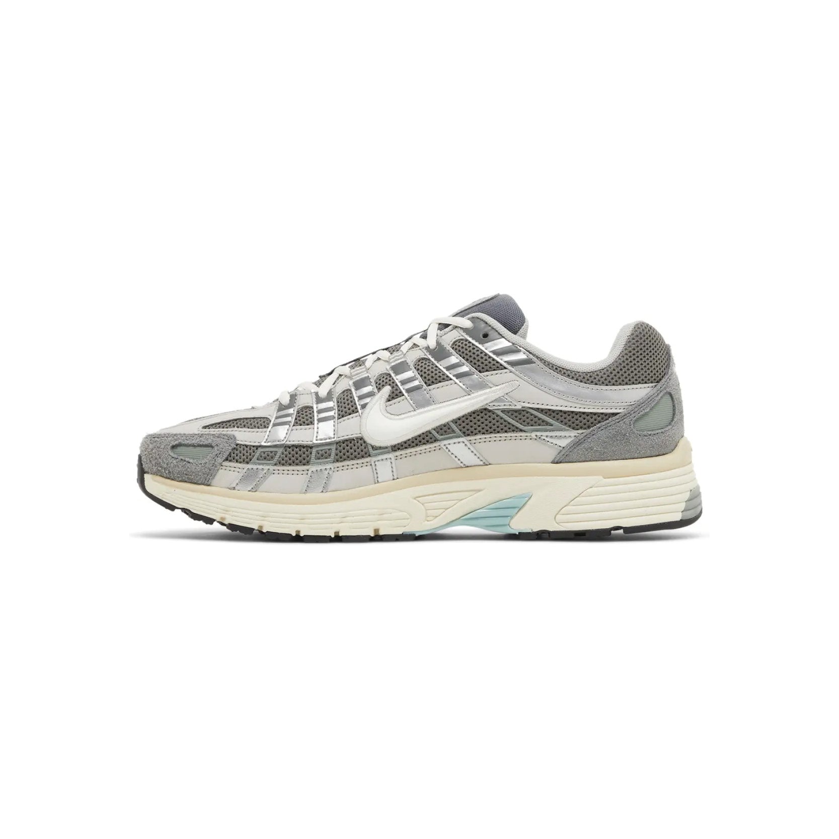The Nike P-6000 'Flat Pewter' brings retro running energy into today’s sneaker scene. Inspired by early 2000s performance runners, this silhouette combines breathable mesh with layered synthetic overlays in varying shades of pewter grey, silver, and white for a bold, multi-textured look.