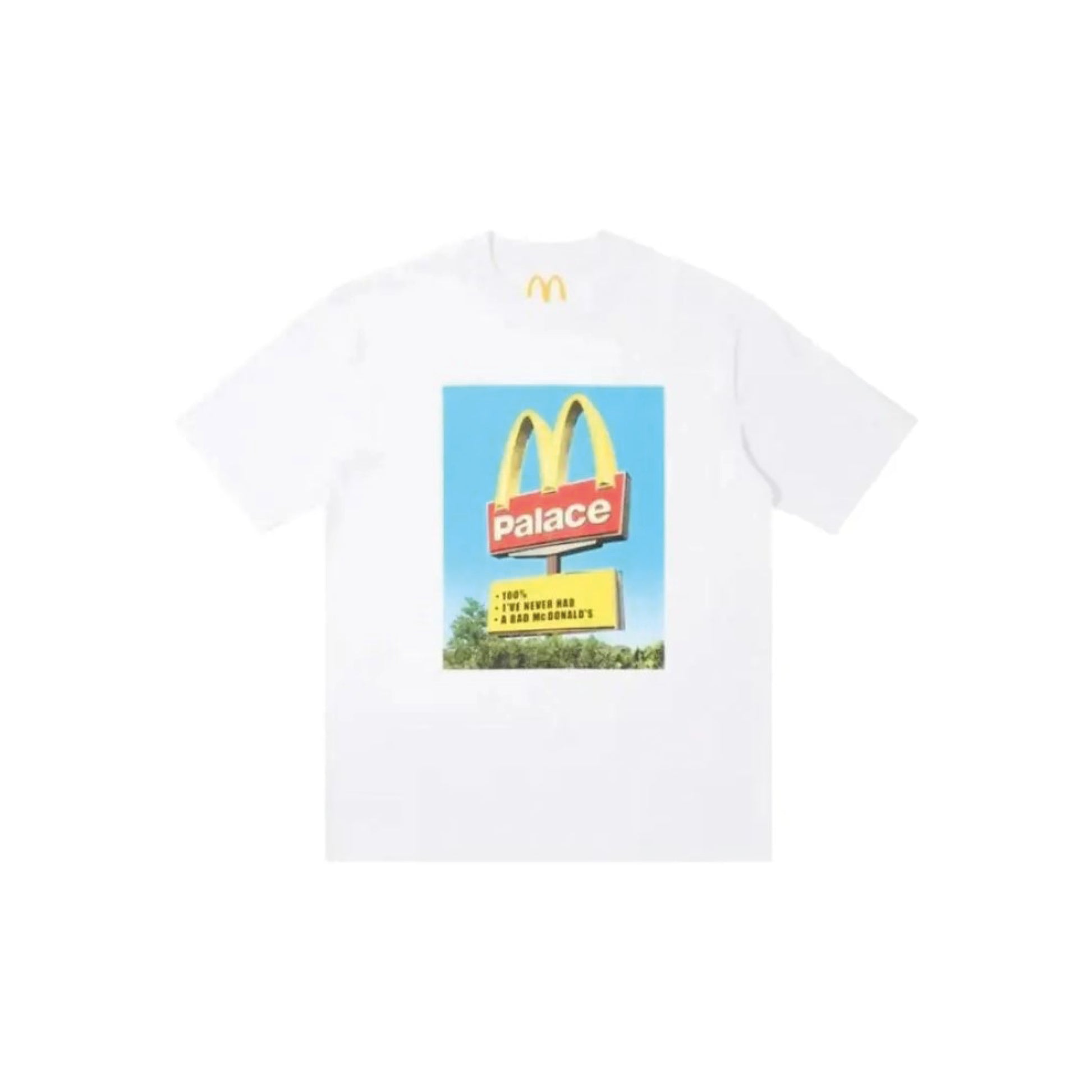 The Palace x McDonald’s Sign SS T-Shirt 'White' is a standout piece from the playful collaboration between Palace and McDonald’s. Featuring a vibrant front graphic of the iconic McDonald’s golden arches rebranded with Palace lettering, this tee merges fast-food nostalgia with streetwear culture. The crisp white cotton base enhances the bold photo-print, while subtle McDonald’s detailing on the collar completes the look. A collectible piece that embodies Palace’s cheeky and irreverent design ethos.