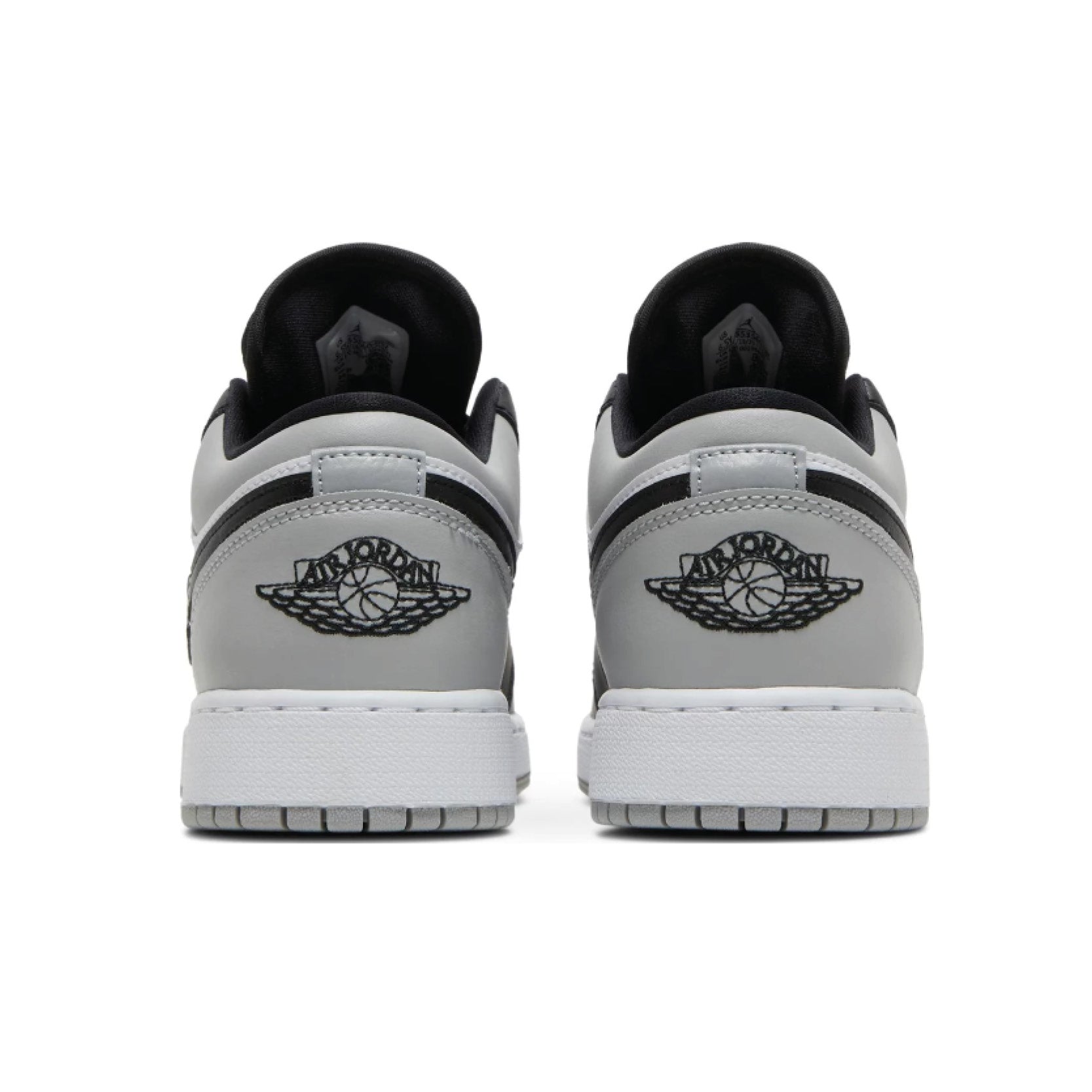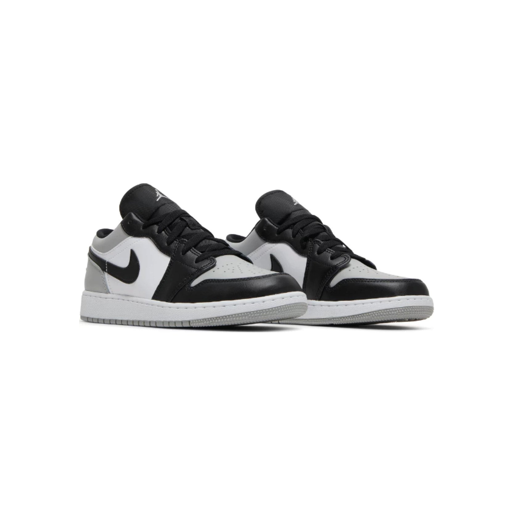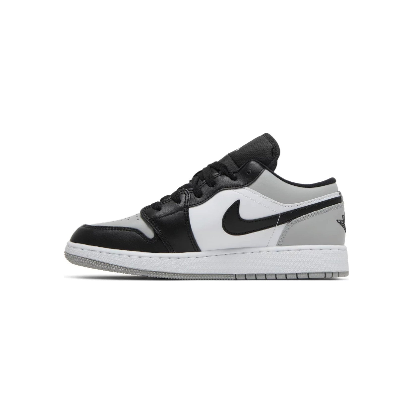 The Air Jordan 1 Low Shadow Toe (GS) for grade schoolers has a color scheme composed of different shades of black, white, and grey. The sole is a bright white with a thin stripe of grey at the very bottom. The upper part of the shoe is made of different pieces of leather, and the Nike swoosh symbol appears in black on the side.