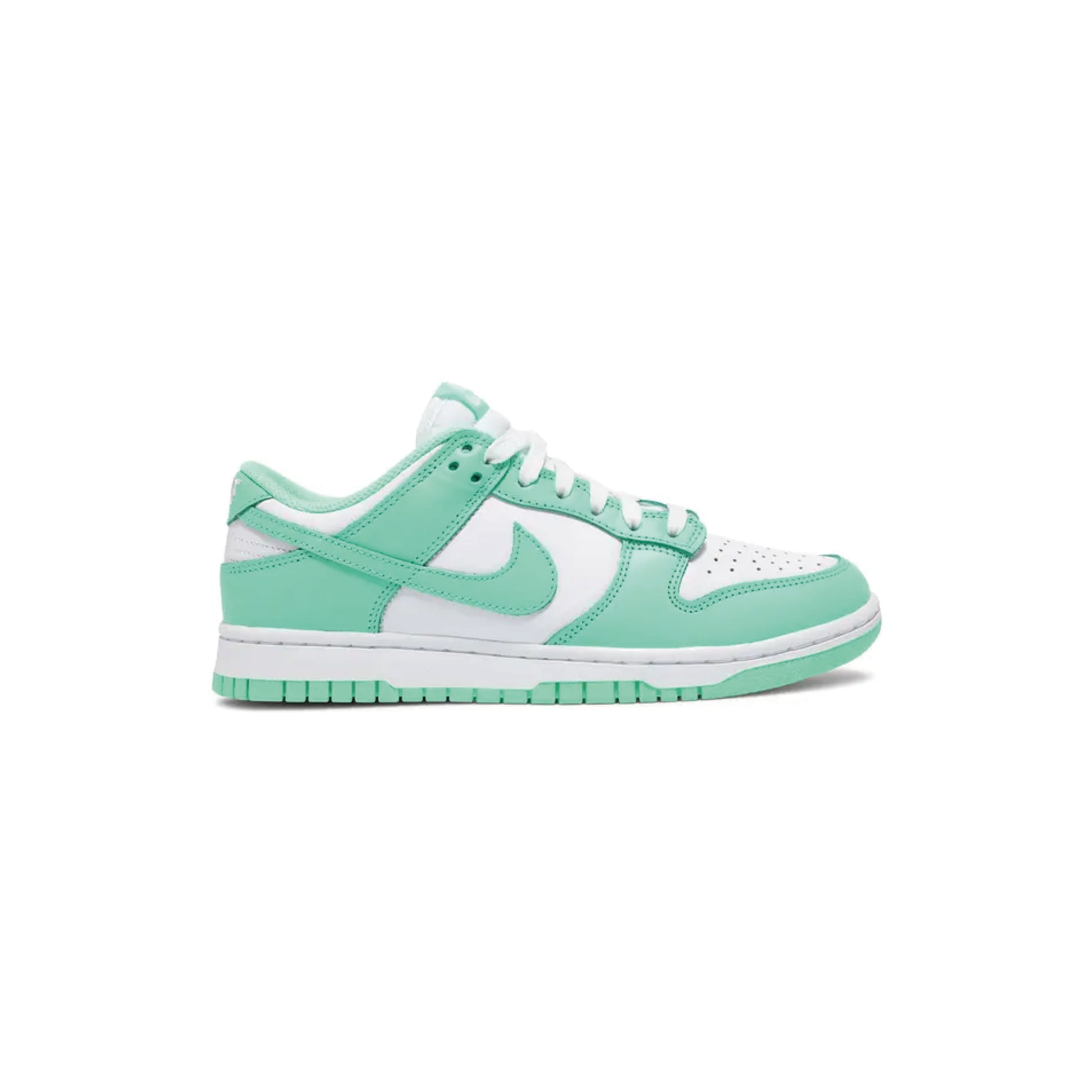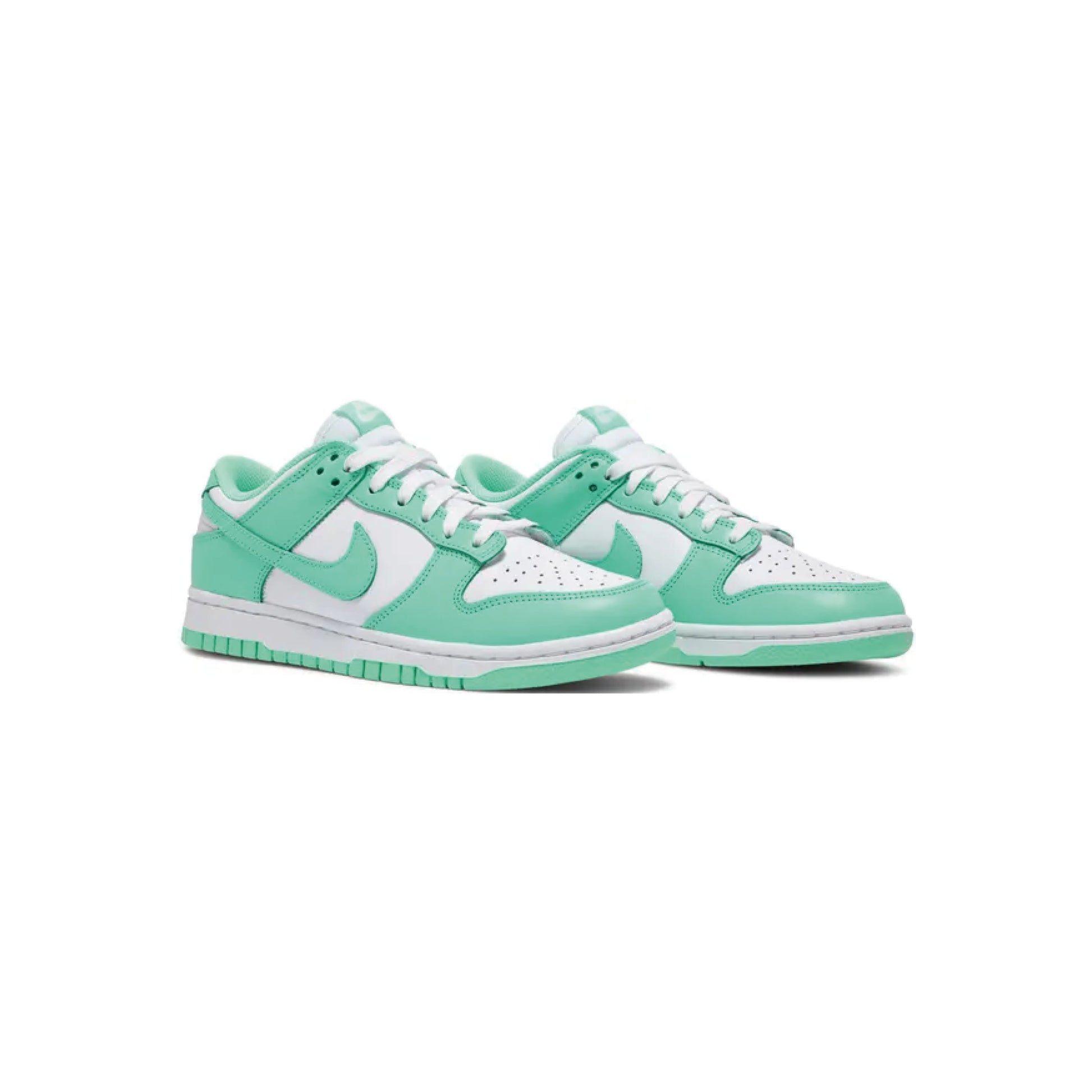 The Nike women’s Dunk Low ‘Green Glow’ showcases traditional color blocking on a customary all-leather build. A crisp white base is contrasted by a vibrant shade of green on the sneaker’s eyestay, Swoosh, and forefoot and heel overlays. The verdant hue is repeated on the woven tongue tag and heel tab, both marked with standard Nike branding. The low-top rides on a two-tone rubber cupsole, equipped with a grippy outsole originally designed for pivoting on the hardwood.