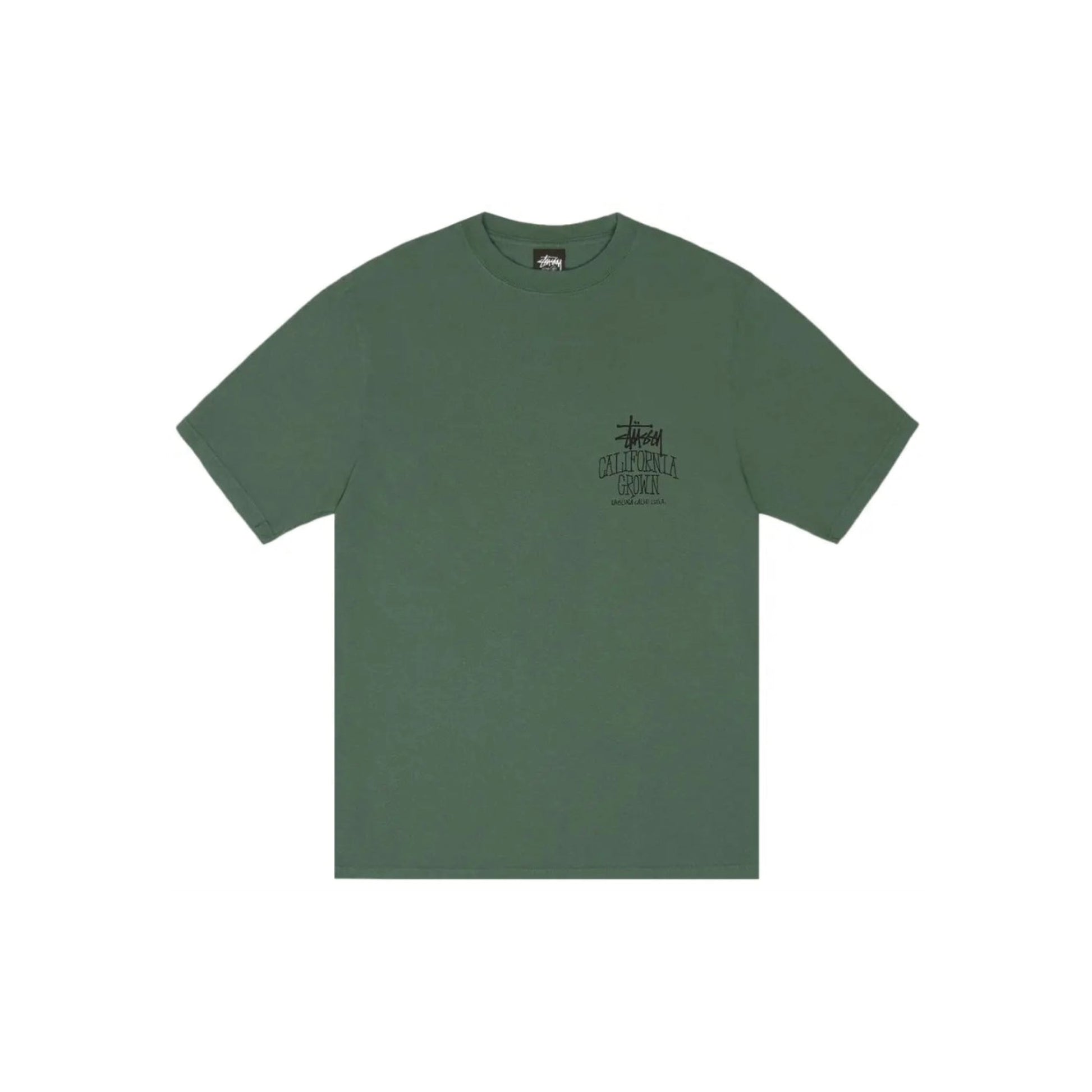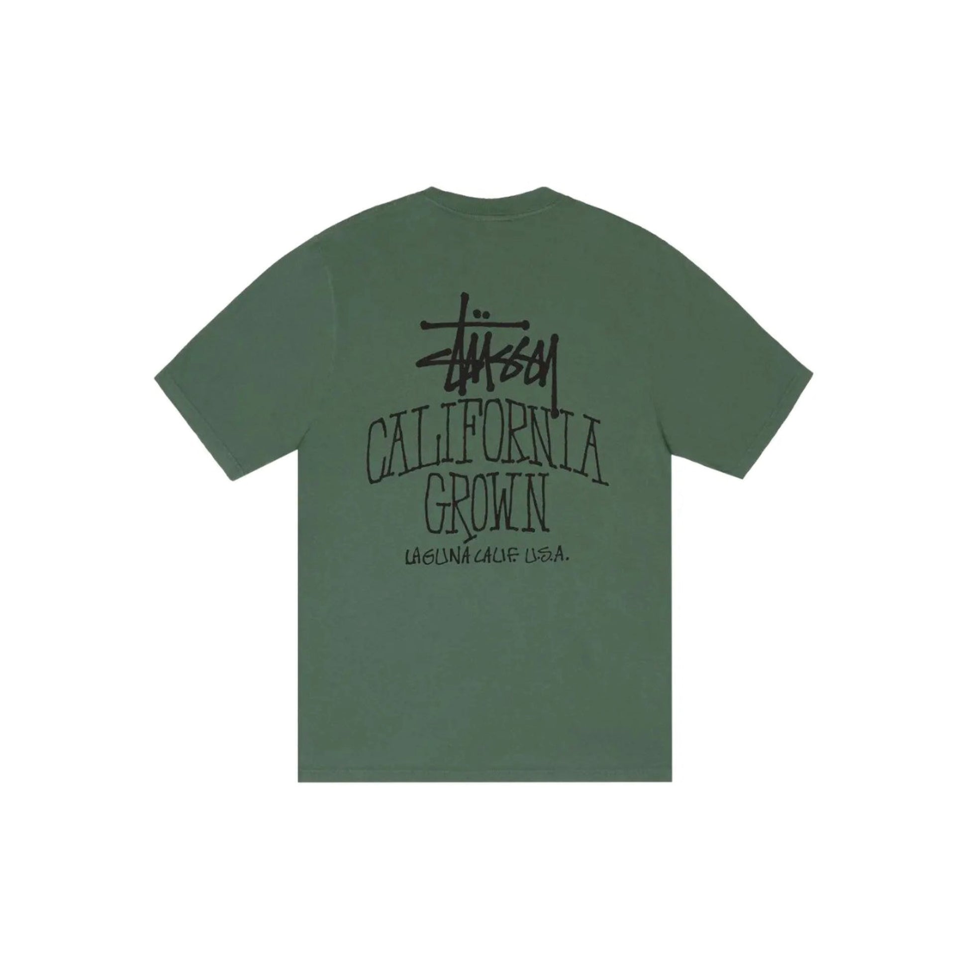 The chest features a small Stüssy Cali Grown graphic, while the back is decorated with an oversized logo print reading “California Grown, Laguna CA/CE USA” — highlighting the label’s roots. The earthy pine green colorway gives the tee a rugged yet versatile vibe that pairs well with both casual and streetwear fits.