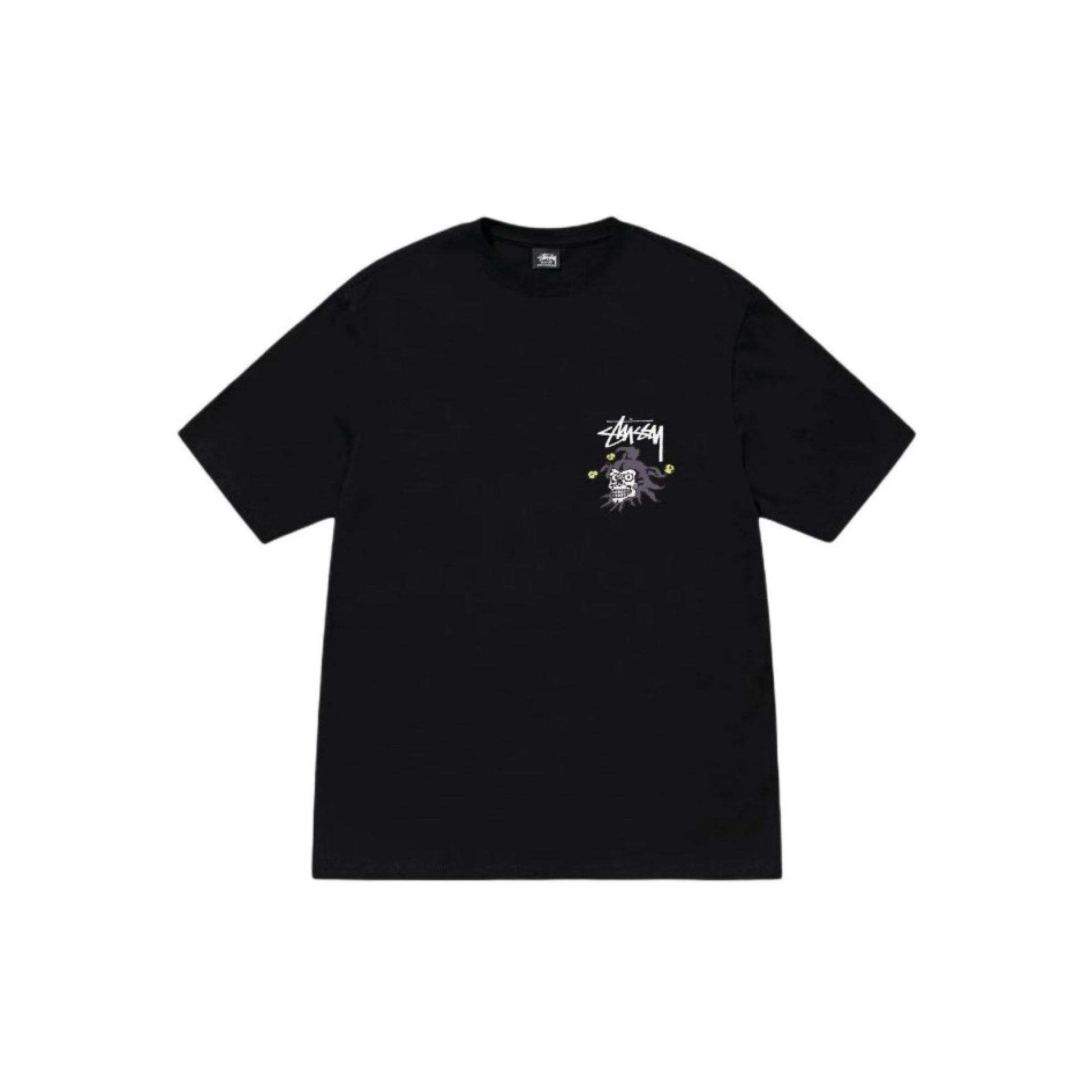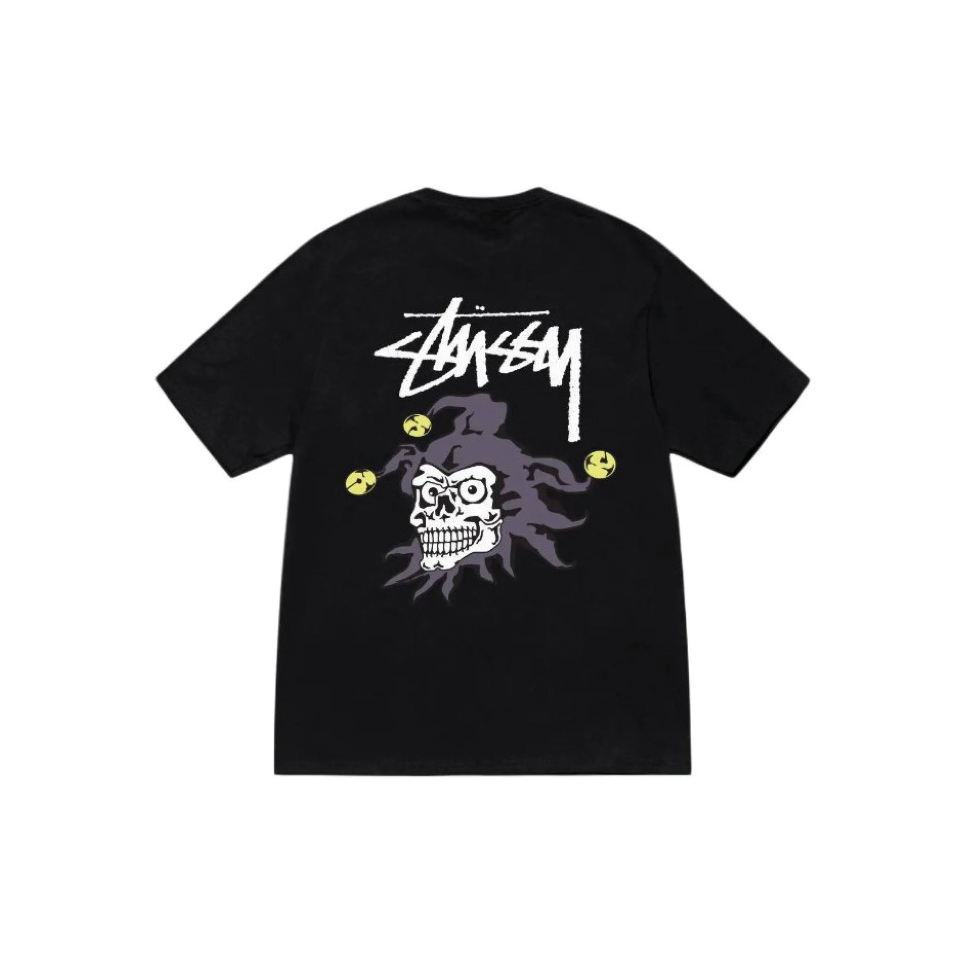 The Stüssy Joker T-Shirt 'Black' combines the brand’s signature streetwear DNA with bold graphic artistry. Crafted from soft cotton, the tee features a small chest graphic with the Stüssy logo and a skull-joker design accented by floating yellow smiley faces. The back makes a stronger statement with a large-scale version of the same graphic, paired with the iconic Stüssy handwritten logo. Dark, playful, and rebellious, this piece perfectly captures Stüssy’s countercultural roots.