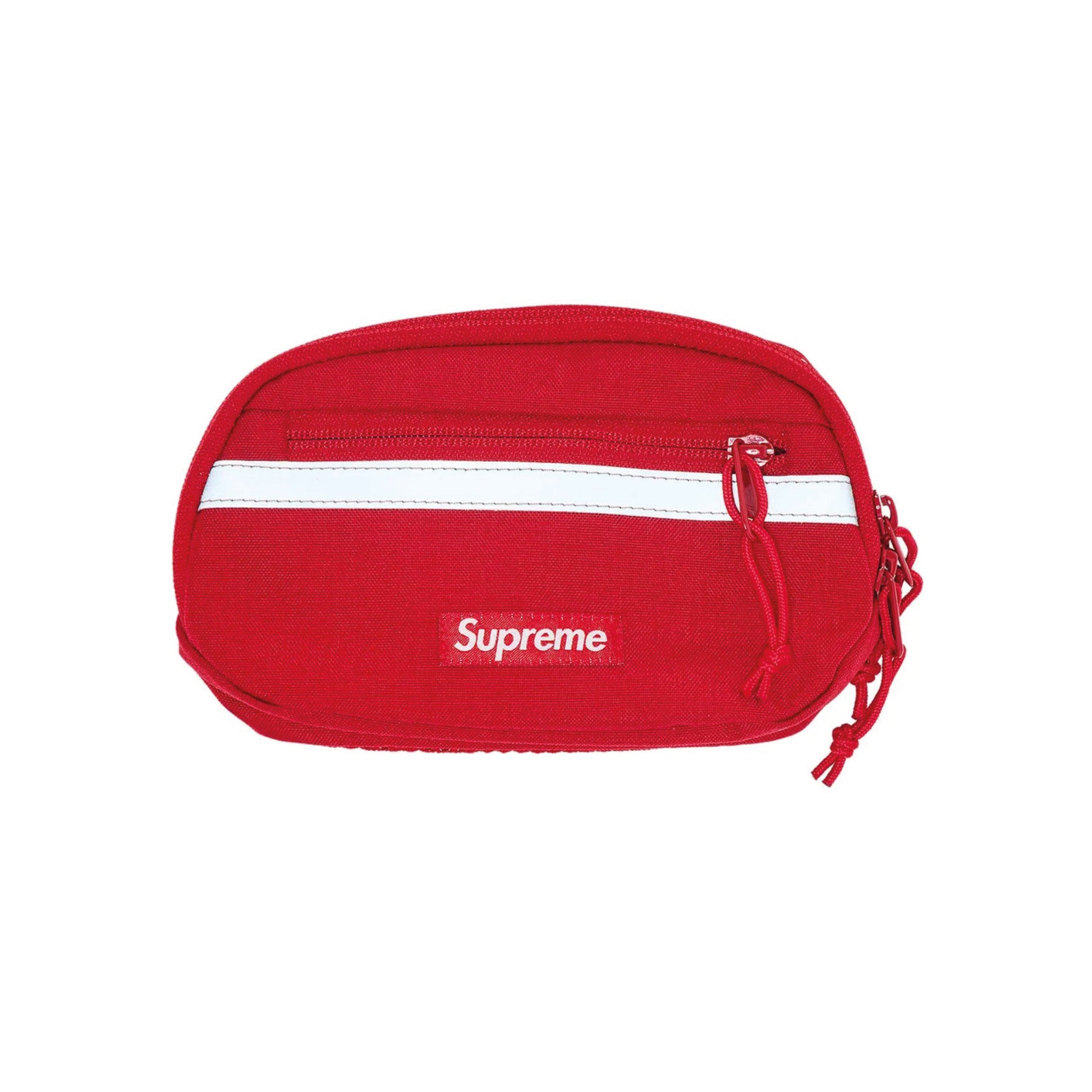 Designed with a sleek rectangular silhouette, it features a main zippered compartment, a front zip pocket, and an adjustable shoulder strap for versatile carry. The bright red colorway is complemented by the iconic Supreme box logo, making it an instantly recognizable accessory for fans of the brand.