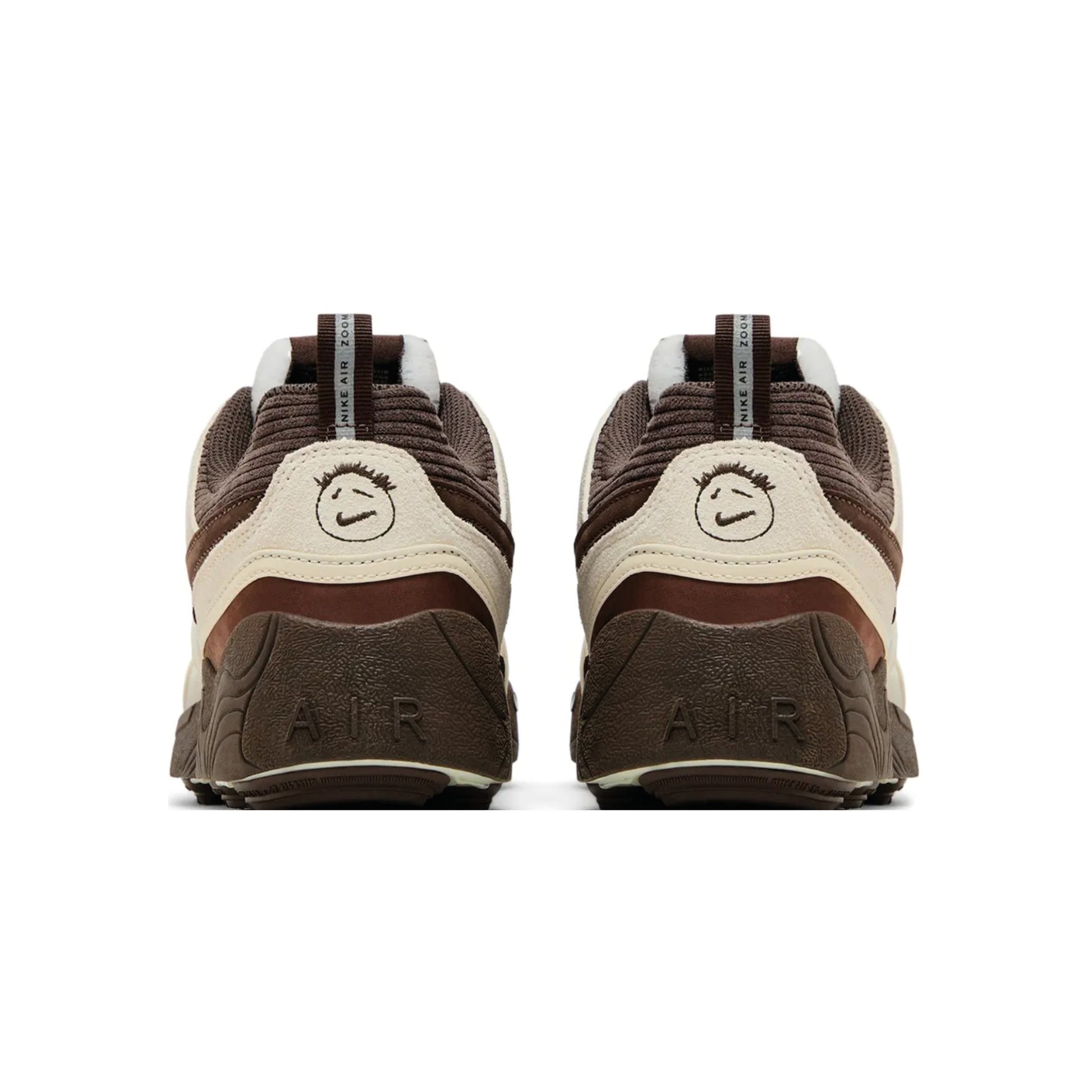 The Travis Scott x Zoom Field Jaxx 'Leche Blue' showcases a suede upper that combines a slate blue base with khaki-colored overlays. An adjustable midfoot strap provides a locked-in fit. Baroque Brown accents land on the signature Swoosh, padded collar, and tongue, featuring dual Nike and Cactus Jack branding. Anchoring the sneaker is a sculpted brown foam midsole lifted from the 1997 Zoom Spiridon.
