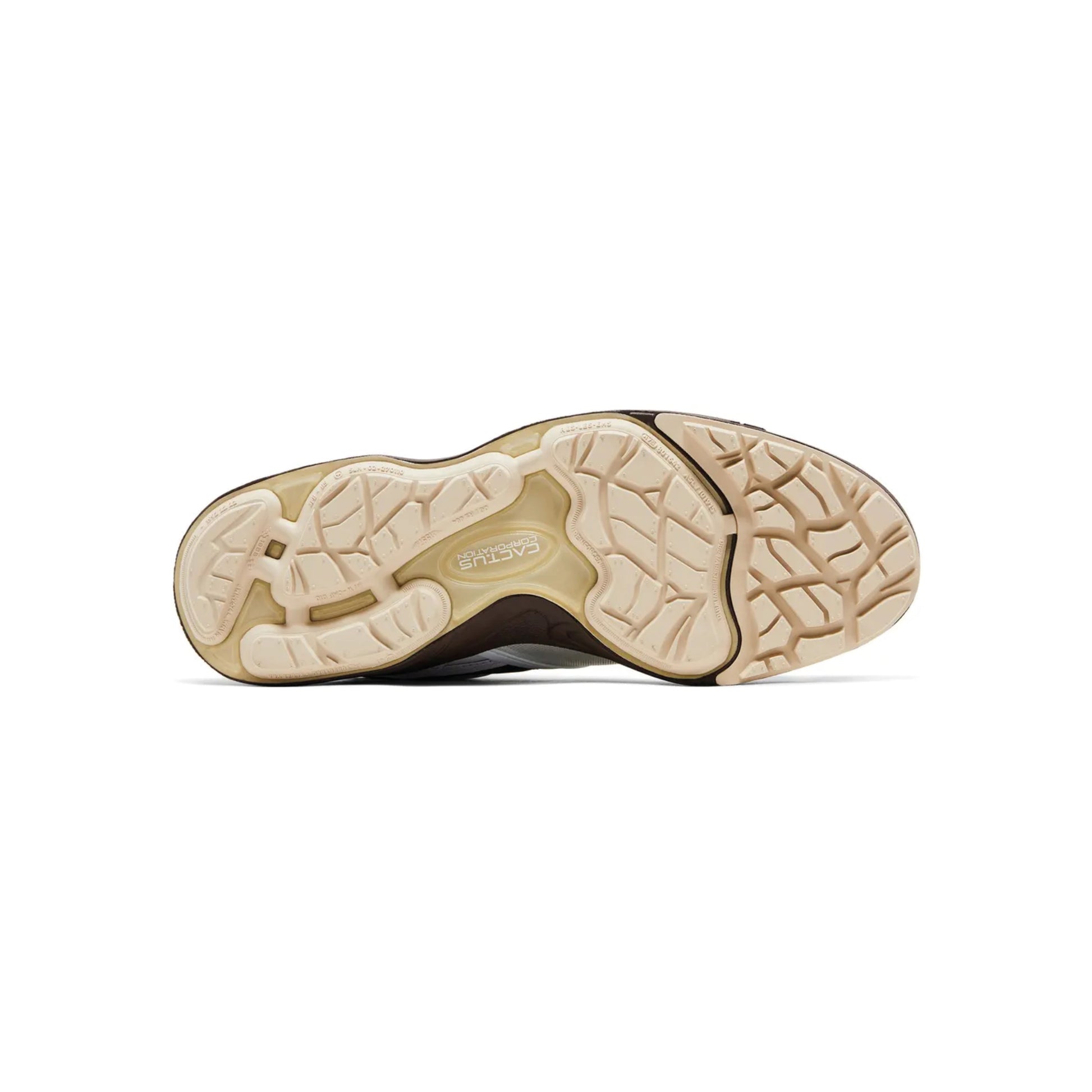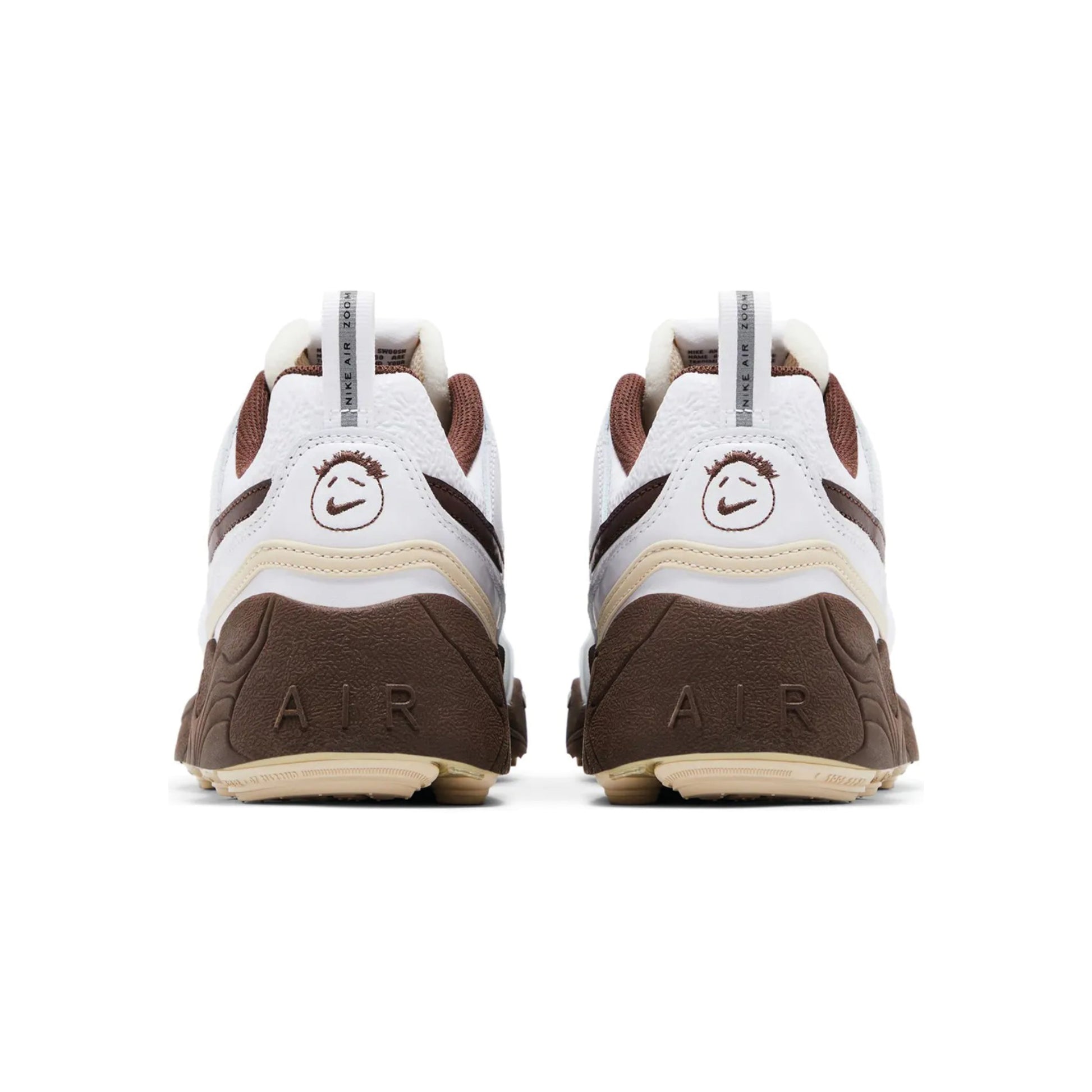 The Travis Scott x Zoom Field Jaxx 'Light Chocolate' features a cream-colored mesh upper with white leather overlays secured with a standard lace closure and an adjustable midfoot strap. Brown accents land on the signature Swoosh, textile collar lining and Nike tongue tag. Lightweight cushioning arrives via a brown foam midsole, etched with wavy lines reminiscent of the Air Zoom Spiridon.